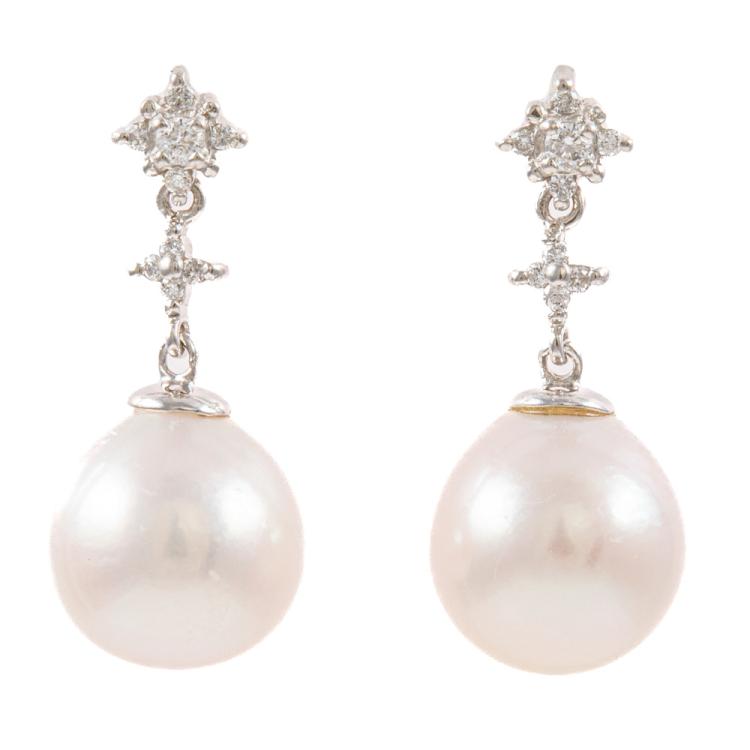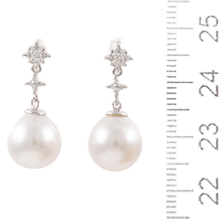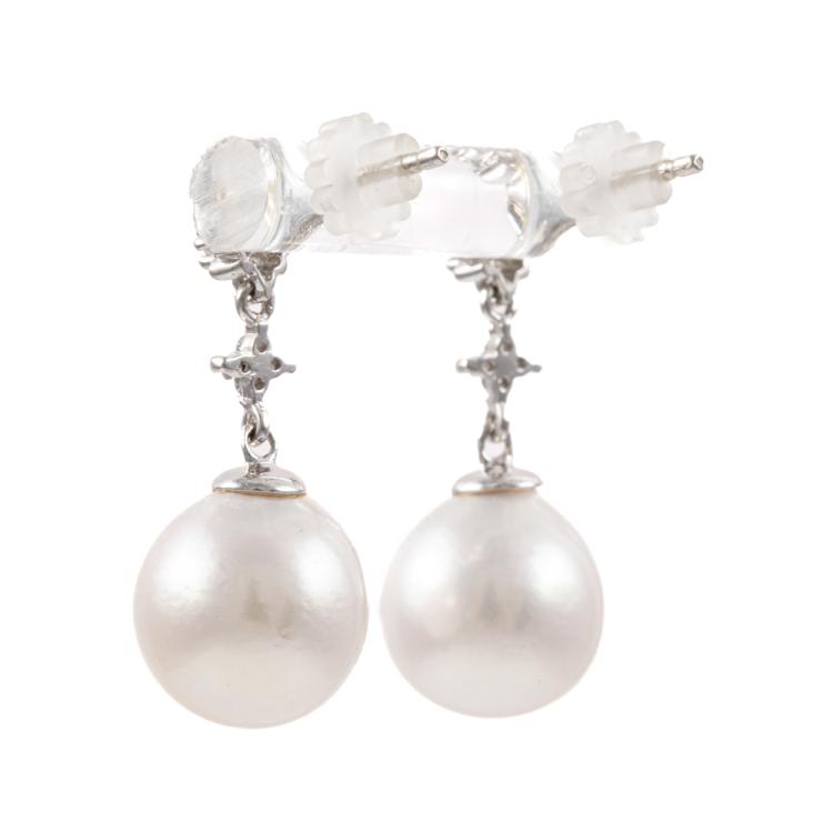 South Sea Pearl and Diamond earrings with South Sea Pearls of 10.0mm - 9.6mm and round Natural Diamonds totalling 0.14ct. Platinum - 900 and silicon backs. Weight: 4.6g. (Pre-owned)