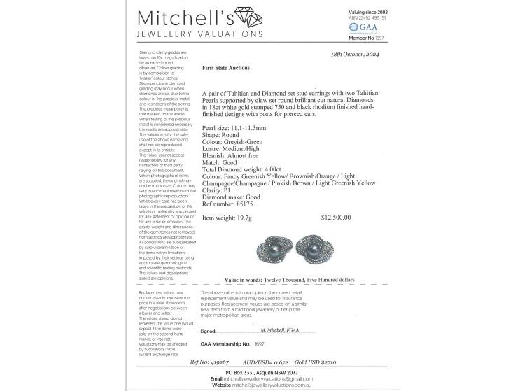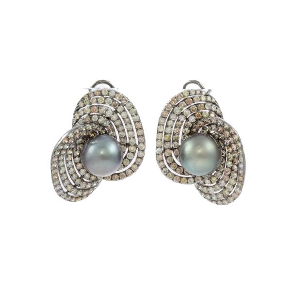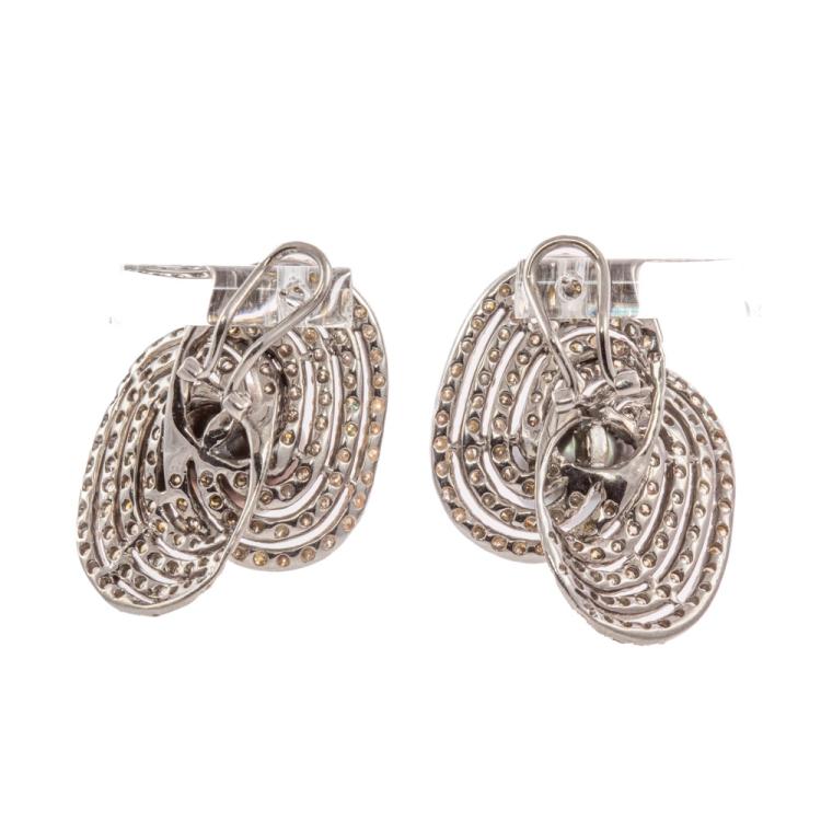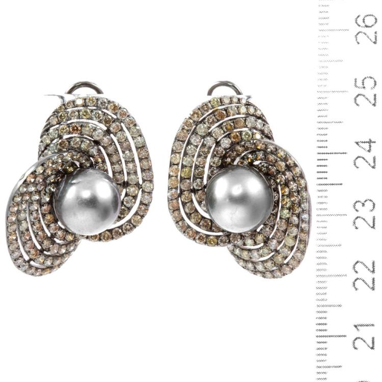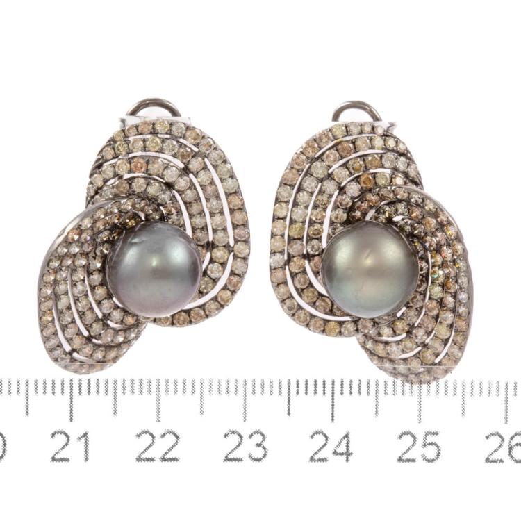 Pearl and Diamond Earring with Tahitian pearls of 11.1mm-11.3mm and round Natural Diamonds totalling approximately 4.00ct (Estimated grading: Fancy Greenish Yellow, Brownish Orange, Light Champagne-Champagne, Pinkish Brown and Light Greenish Yellow P1). 18ct white gold with black rhodium plating. Total weight: 19.7g. With Certificate #419267. (Pre-owned)