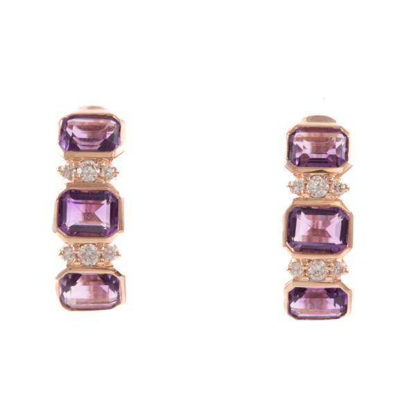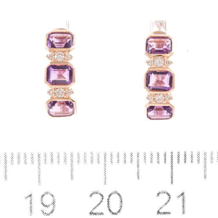 Amethyst and Diamond huggie earrings with 3 emerald cut Natural Amethyst totalling 1.15ct and round Natural Diamonds totalling 0.09ct. 14ct rose gold. Weight: 2.5g. (New)