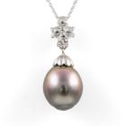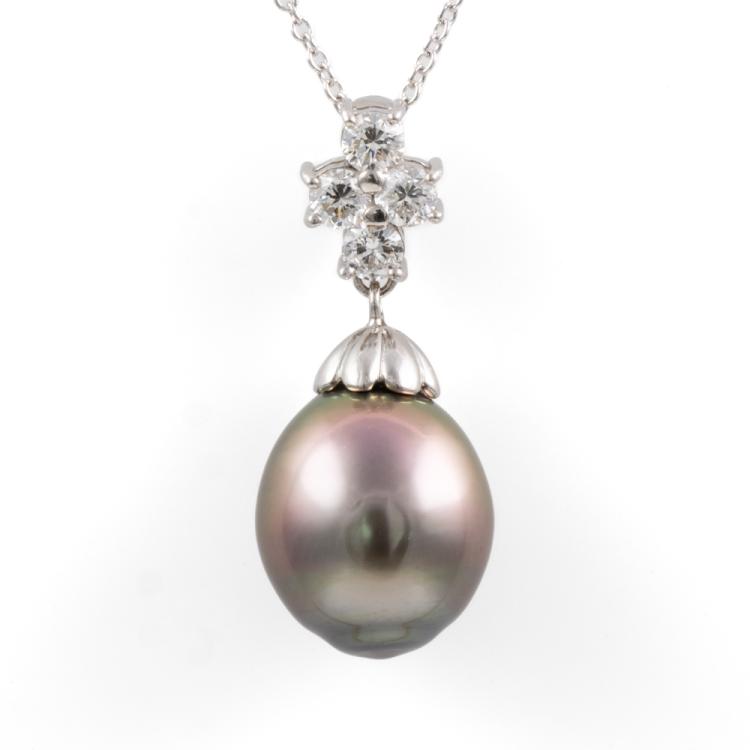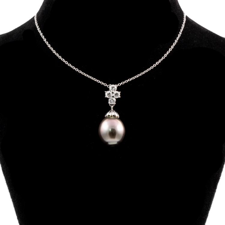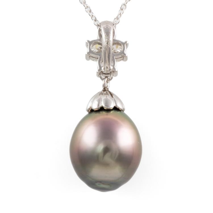 Pearl and Diamond pendant with an oval shape Tahitian Pearl of 11.6mm and Diamonds totalling 0.44ct (Estimated grading: H SI). Platinum 900 with 14ct white gold 40cm chain. Weight: 5.3g. (Pre-owned)