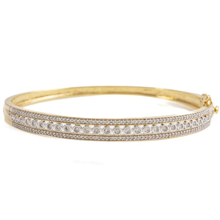 Diamond bangle with round Natural Diamonds totalling approximately 1.20ct (Estimated grading: J-K SI). 9ct yellow and white gold. Circumference: 16.2cm. Width: 3.2mm - 5.0mm. Weight 14.6g. (Pre-owned)