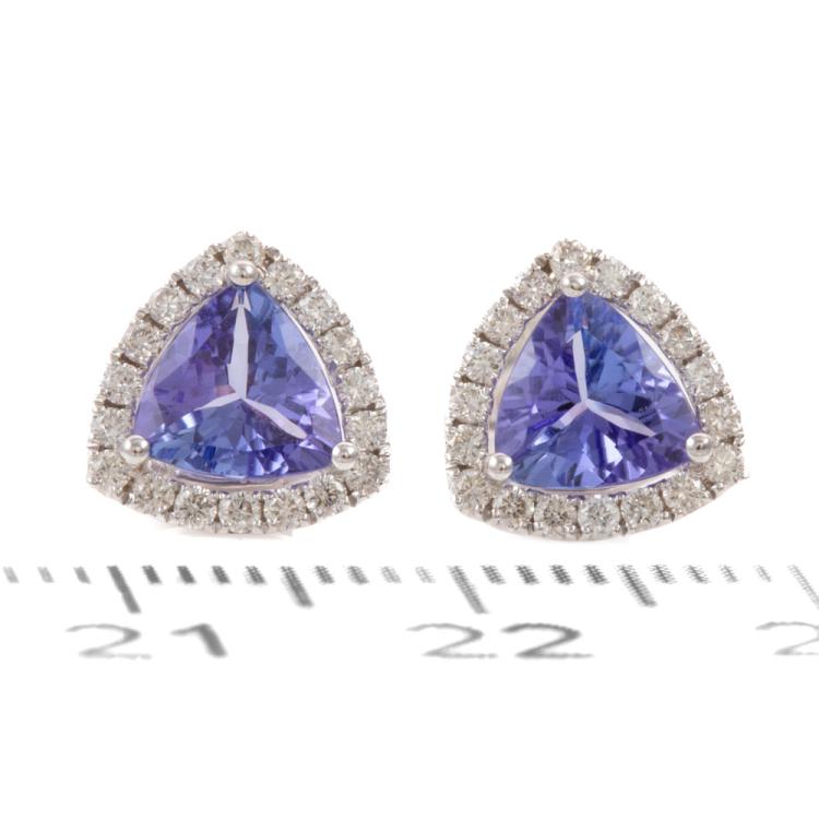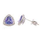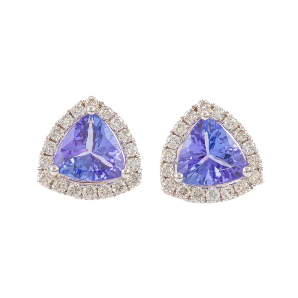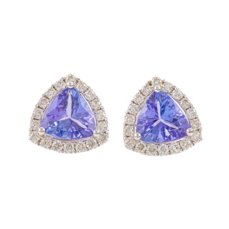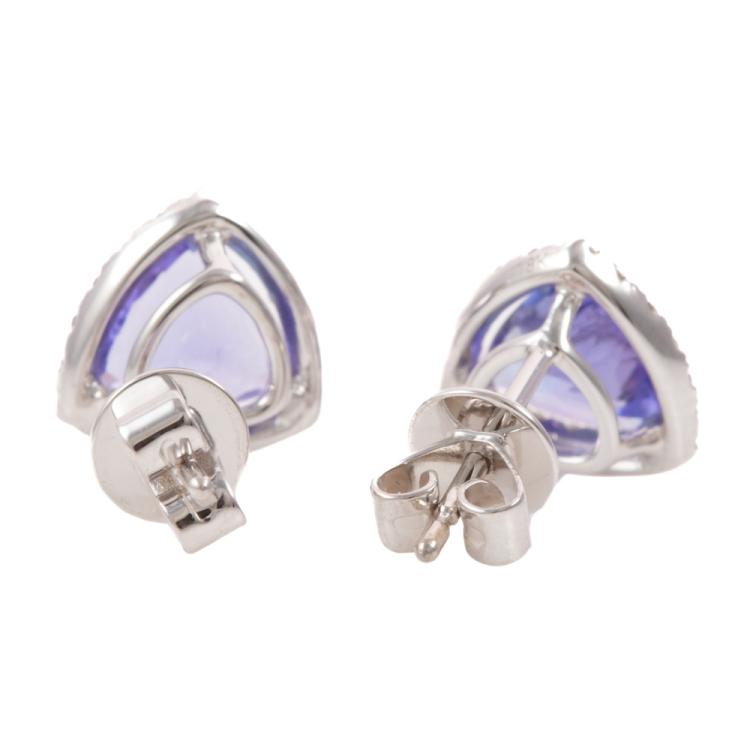 Tanzanite and Diamond earrings with trilliant cut Natural Tanzanite totalling 1.24ct and round Natural Diamonds totalling 0.29ct. 18ct white gold. Weight: 1.9g. (New)