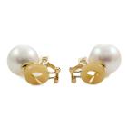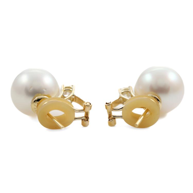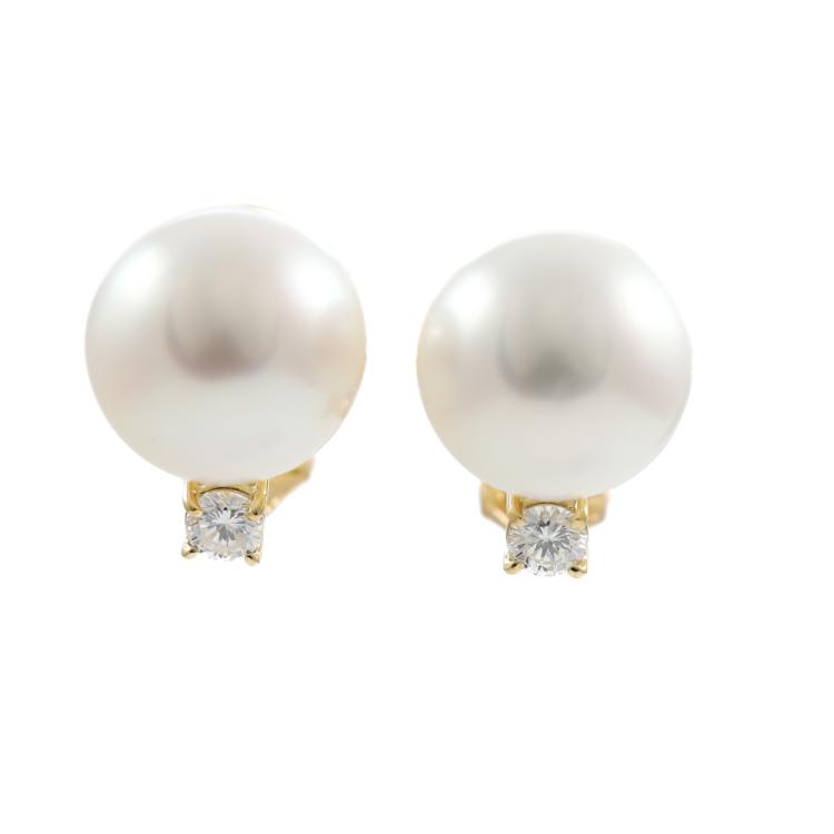 Pearl clip-on earrings (for pierced ears) with 2 South Sea Pearls of 12.8mm & 13.0mm and 2 round Natural Diamonds totalling 0.35ct (Estimated grading: G-H SI). 18ct yellow gold. Weight: 9.3g. (Pre-owned)