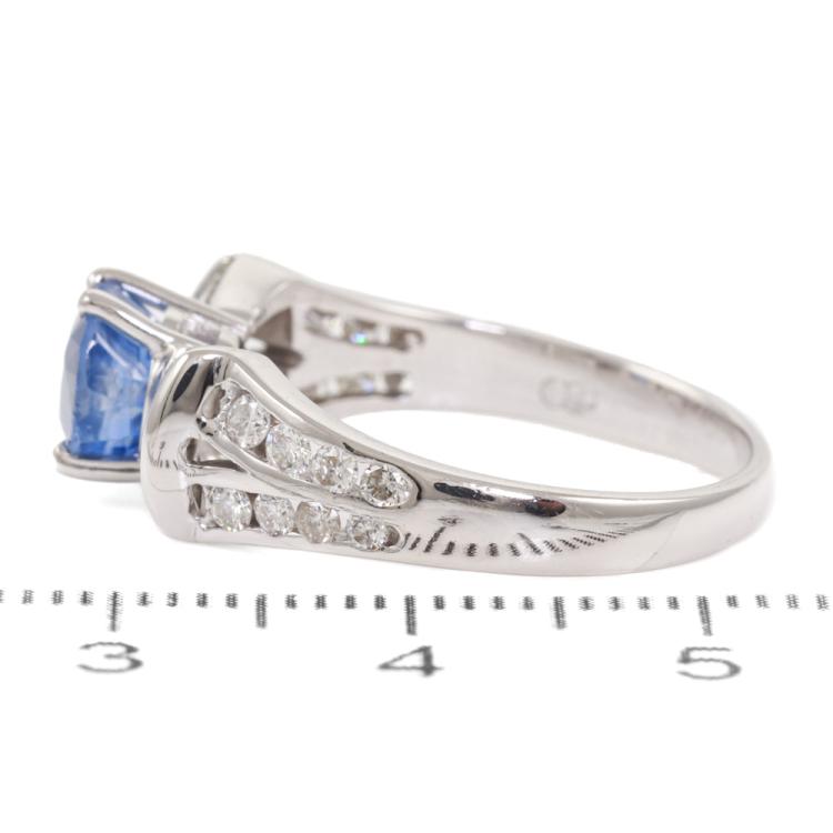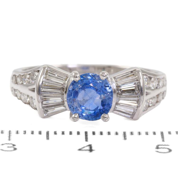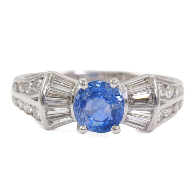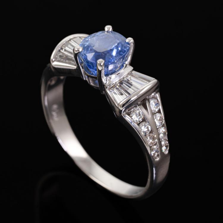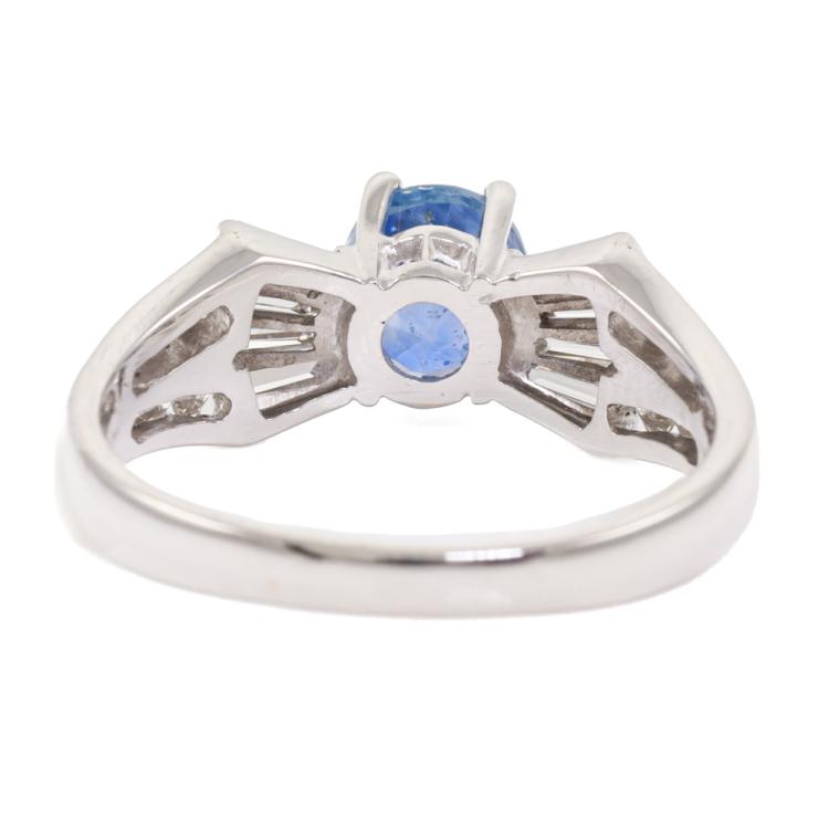 Sapphire and Diamond ring with an oval shape Natural blue Sapphire of approximately 1.40ct and round & baguette cut Natural Diamonds totalling approximately 0.84ct (Estimated grading: I-J SI). 18ct white gold. Ring size Q. Band width: 2.3mm-4mm. Weight: 5.1g. (Pre-owned)