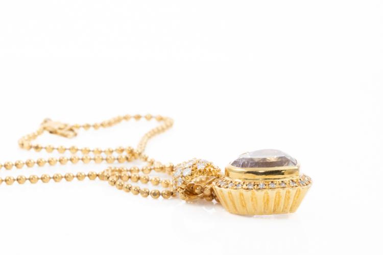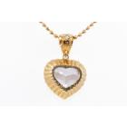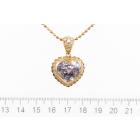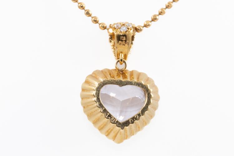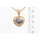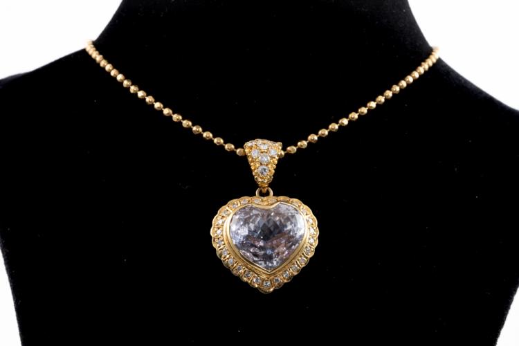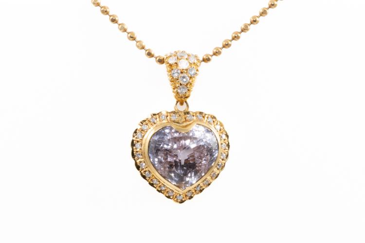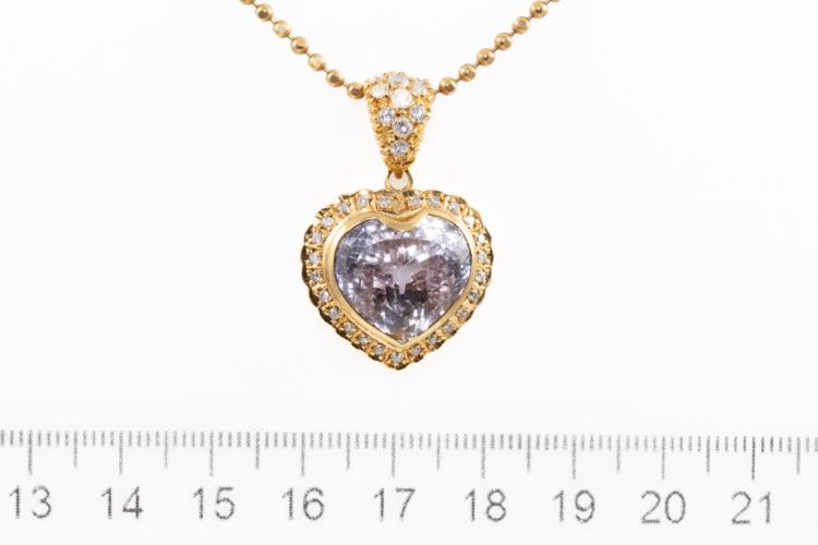 Kunzite and Diamond pendant with a heart shape Kunzite of 14.38ct and round Natural Diamonds totalling 0.77ct (Estimated grading: G SI). 18ct yellow gold with 41cm 18ct yellow gold chain. Weight: 16.5g. (Pre-owned)