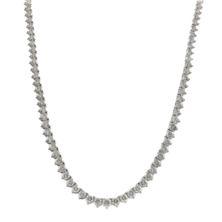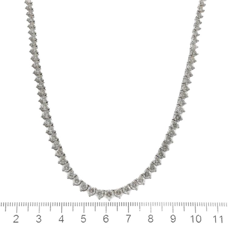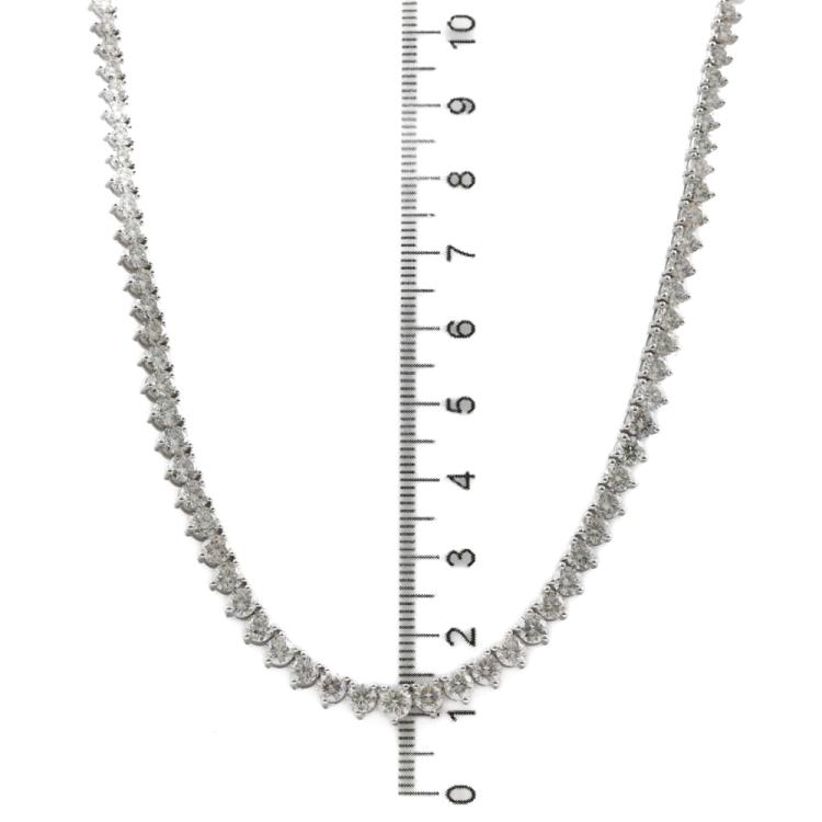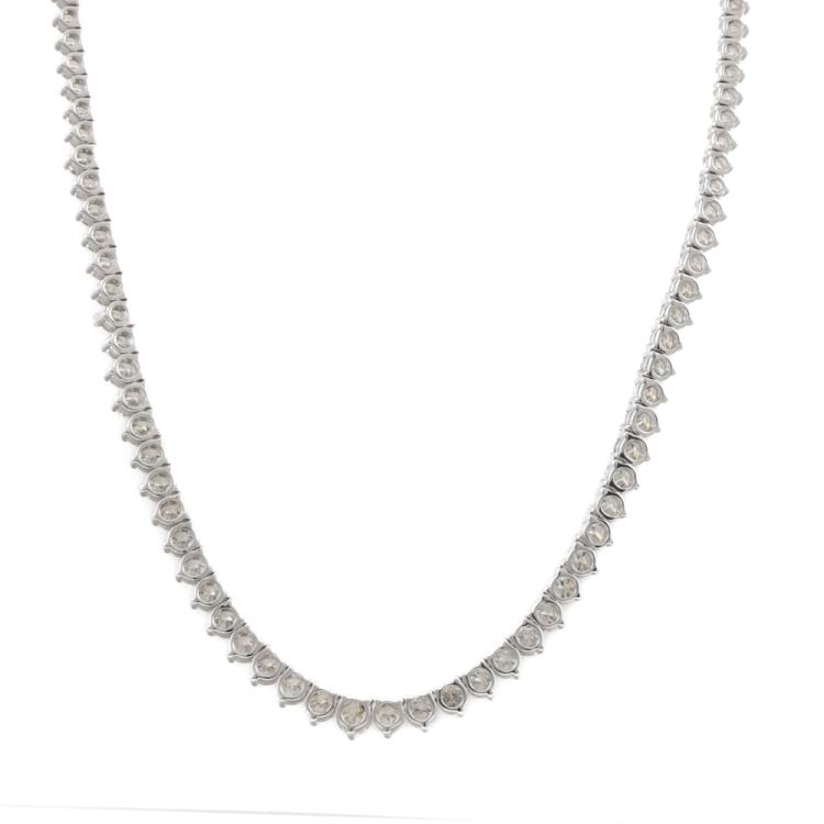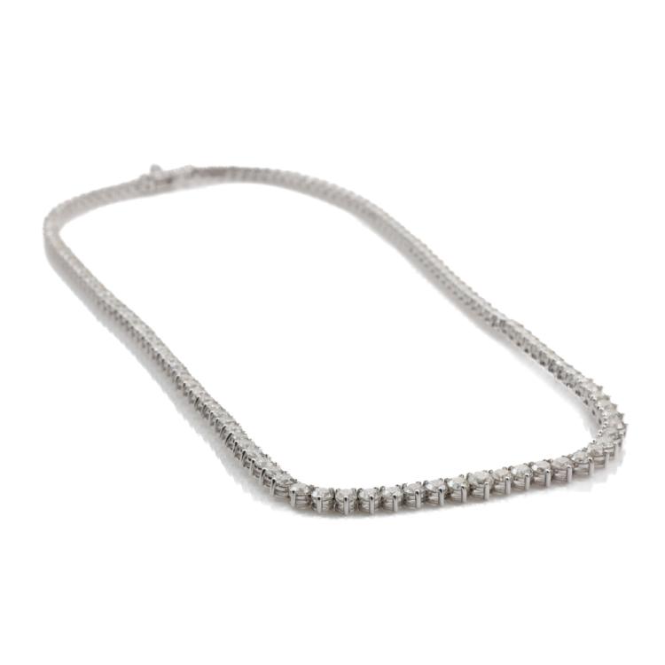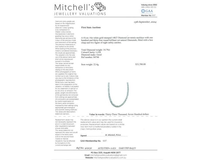 Diamond tennis necklace with 134 round brilliant cut Natural Diamonds totalling 14.79ct (Estimated grading: I-J SI). 14ct white gold. Length: 41cm. Weight: 22.4g. With Valuation Certificate #419132. (New)