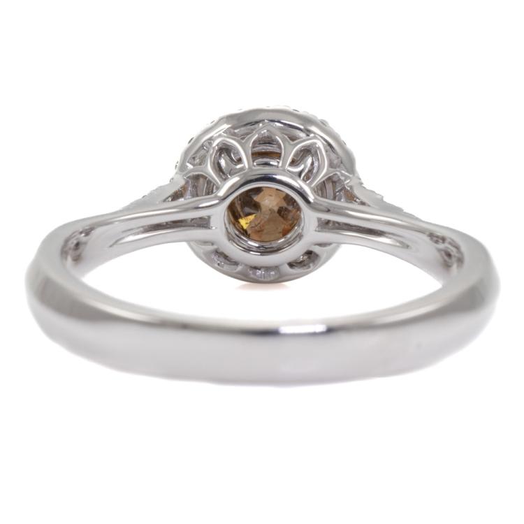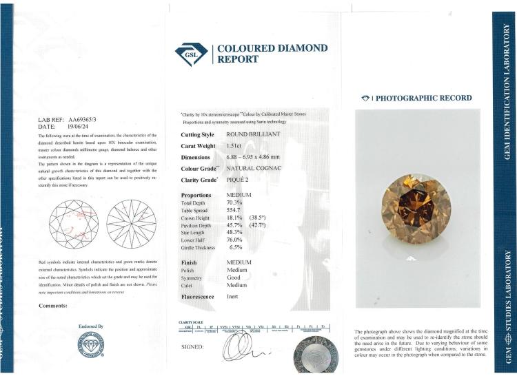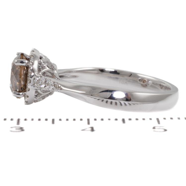 Diamond halo ring with centre round brilliant cut natural Cognac Diamond of 1.51ct (with GSL Report graded as Natural Cognac P2 #AA69365/3) and remaining round natural Diamond totalling 0.20ct. 18ct white gold. Ring size N. Band width: 2.7mm - 1.9mm. Weight: 4.4g. (New)