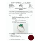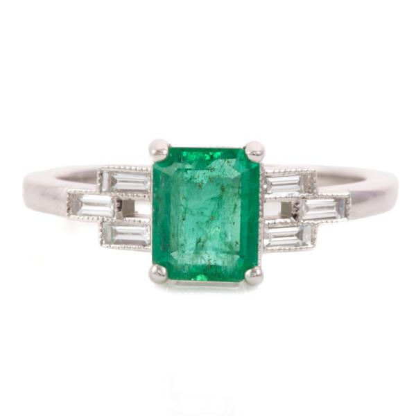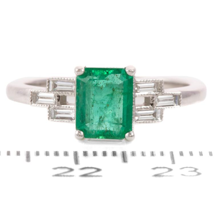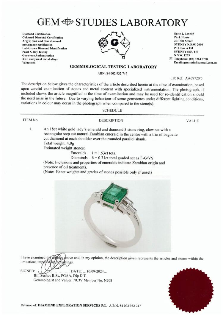 Emerald and Diamond ring with rectangular step cut Zambian Natural Emerald of 1.53ct and 6 baguette cut Natural Diamonds totalling 0.31ct (Estimated grading: F-G VS). 18ct white gold. Ring size O. Band width: 1.9mm. Weight: 4.0g. With GSL Description Certificate #AA69720/5. (As New)