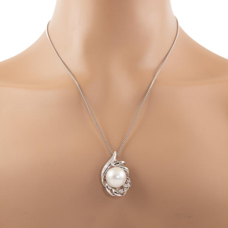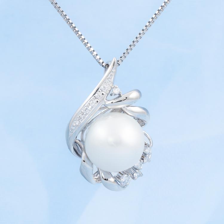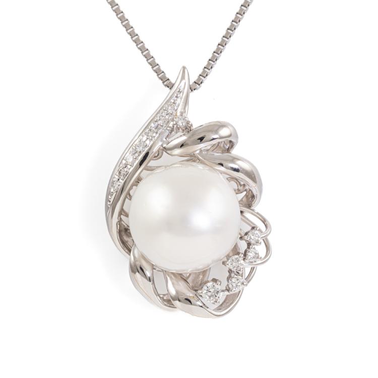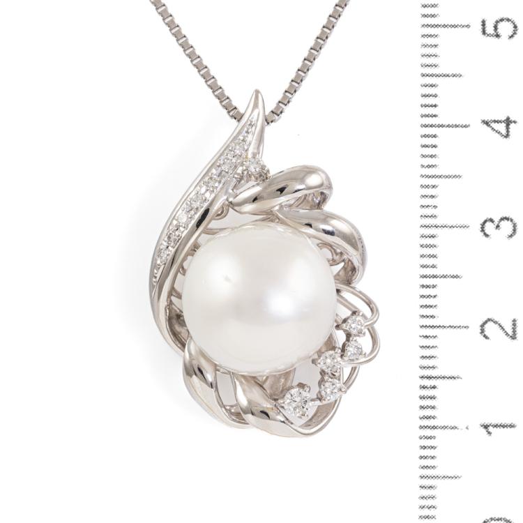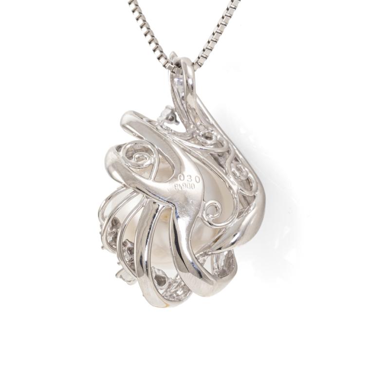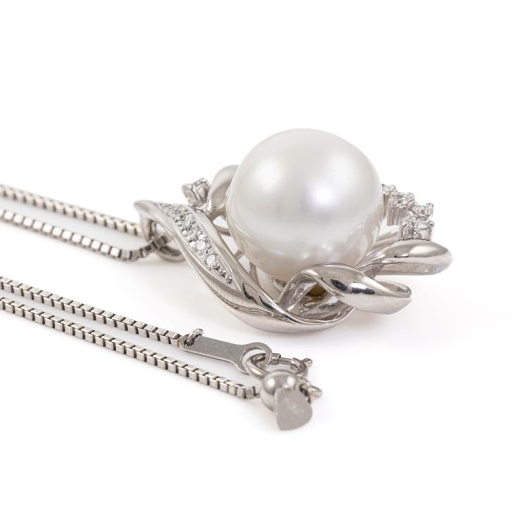 Pearl and Diamond pendant with round South Sea Pearl of 15mm and round Natural Diamonds totalling 0.30ct (Estimated grading G-H SI). Platinum 900 with Platinum 850 adjustable 50cm chain. Weight: 22.5g. (Pre-owned)