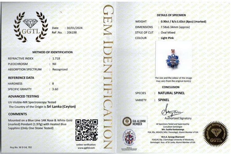 Spinel and Sapphire pendant with centre oval light pink natural Ceylon Spinel of 0.90ct and round natural blue Ceylon Sapphire totalling 1.63ct. 14ct white & rose gold. No chain provided. Weight: 1.9g. With GGTL Report #206198. (As New)