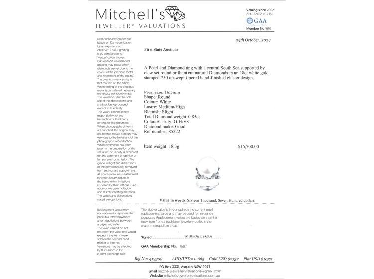 Pearl and Diamond ring with South Sea Pearl of 16.5mm and round Natural Diamonds totalling 0.85ct (Estimated grading G-H VS). 18ct white gold. Ring Size: R1/2. Band width: 2.9mm - 5mm. Weight 18.3g. With Certificate #419309. (Pre-owned)
