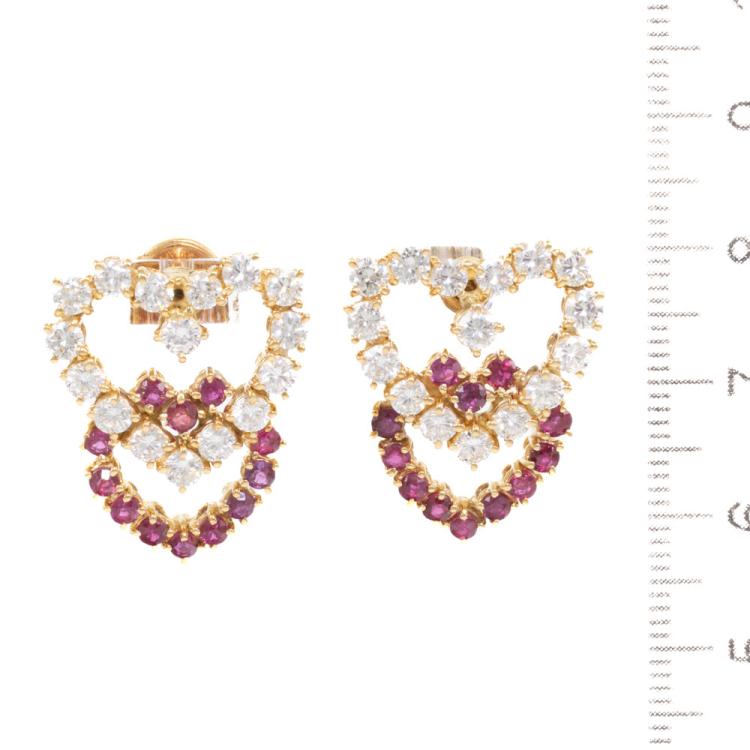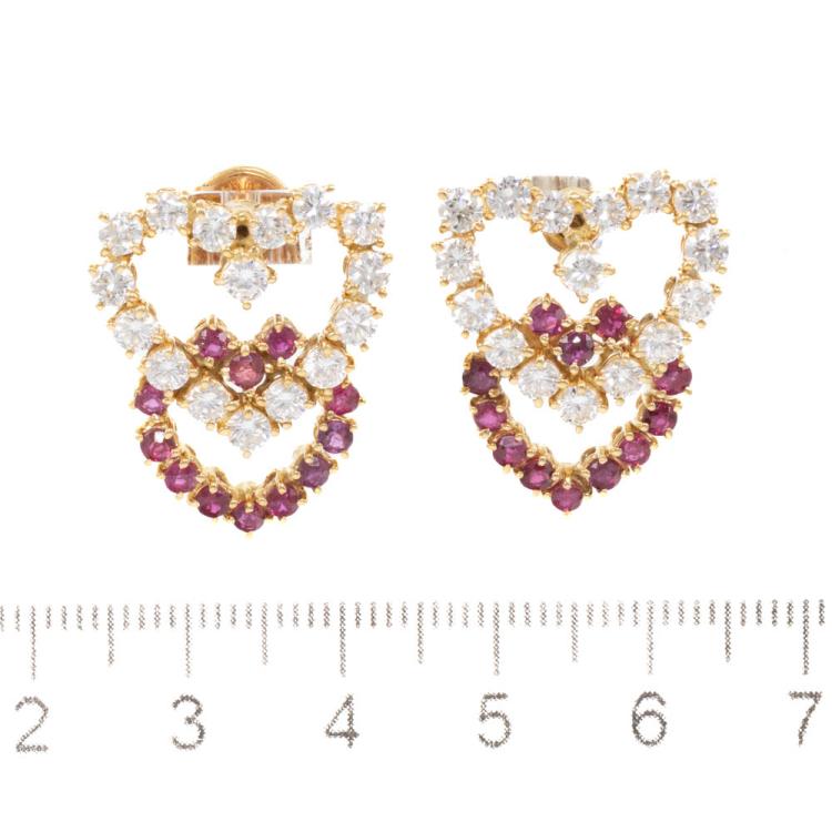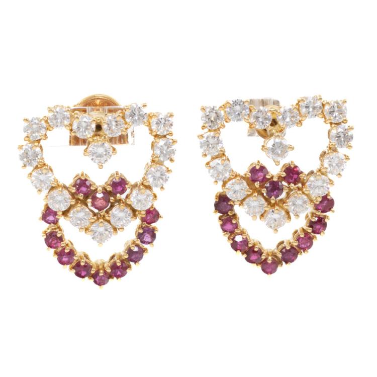 Double heart design earrings with round natural Rubies totalling 1.68ct and round natural Diamonds totalling 2.90ct (Estimated grading: H-I VS-SI). 18ct yellow gold. Note backs don’t match, one is 18ct yellow gold and one is silver. Weight: 10.9g. With Appraisal dated 10/08/15. (New)
