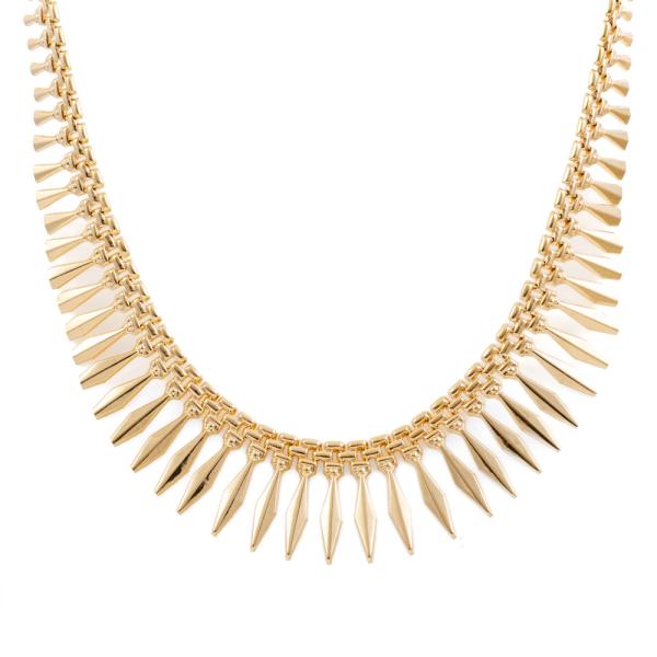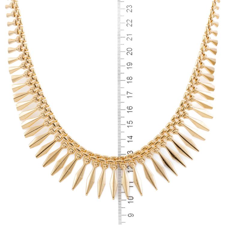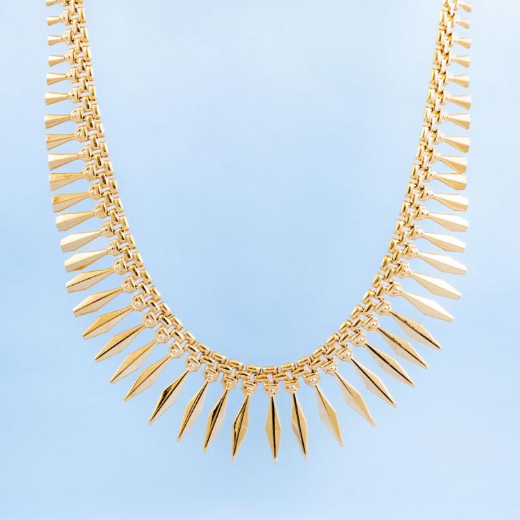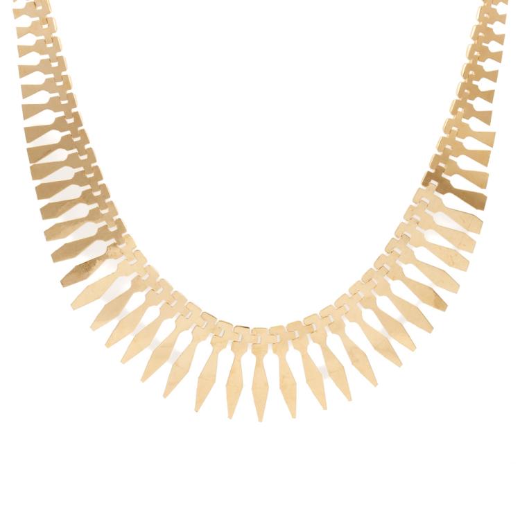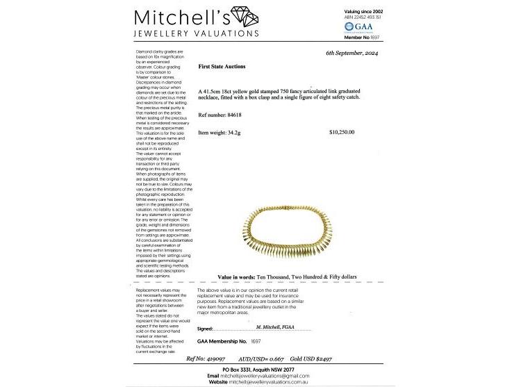 Gold necklace comprised of graduated articulated link and shield shape motifs. Length: 41.5cm. Width: 9.0mm - 27.0mm. Weight: 34.2g. With Valuation Certificate: #419097. (Pre-owned)