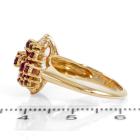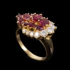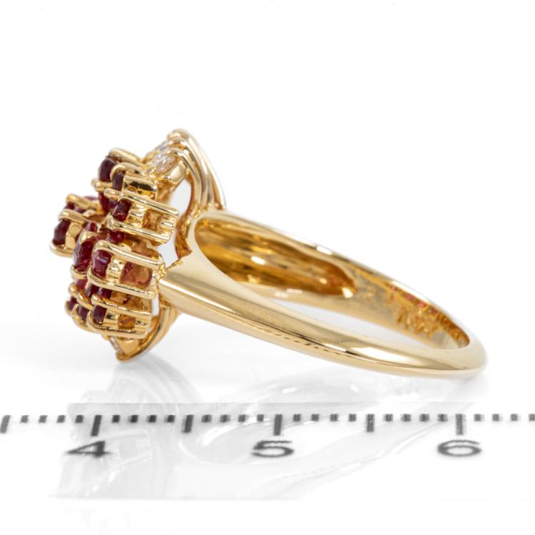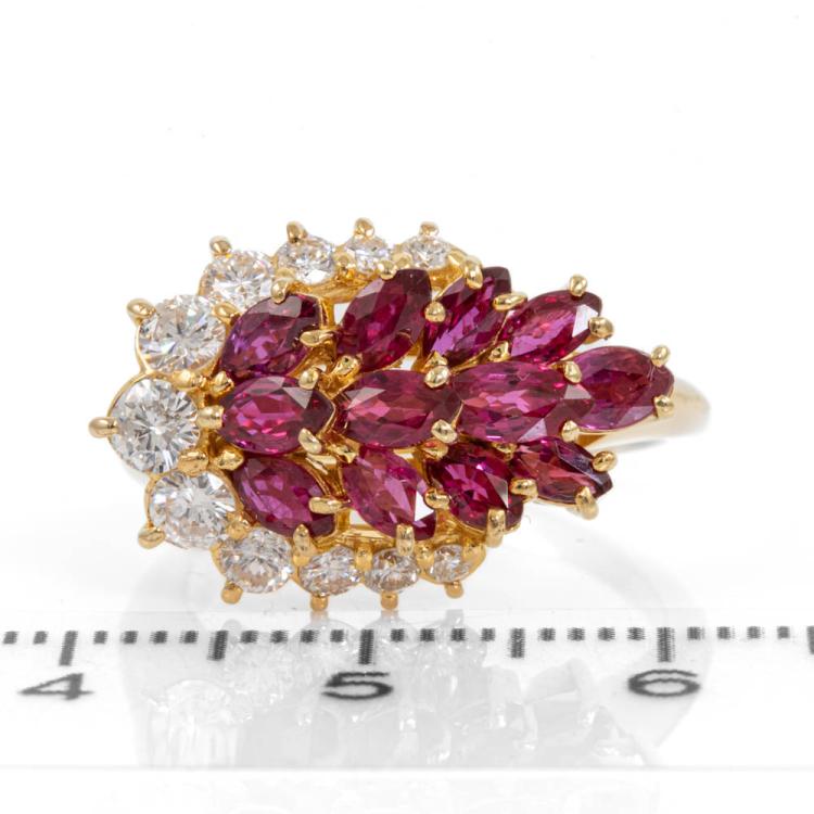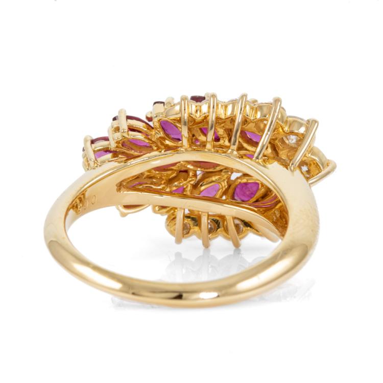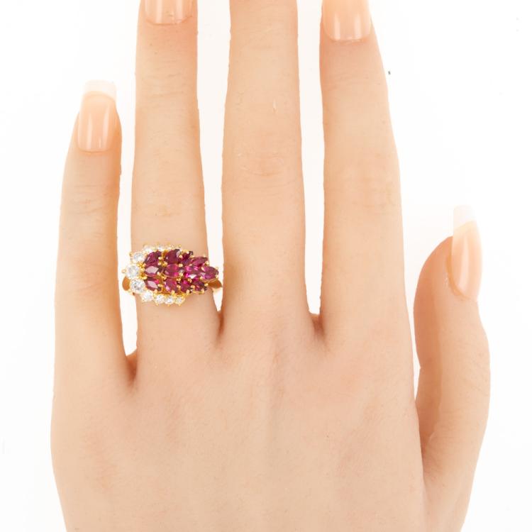 Ruby and Diamond ring with marquise cut Natural Rubies totalling 2.13ct and round Natural Diamonds totalling 0.65ct (Estimated grading: G VS). 18ct yellow gold. Ring size L. Band width: 2mm - 4.4mm. Weight: 6.7g. (Pre-owned)
