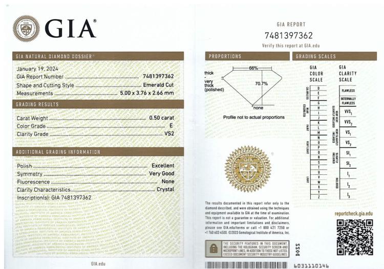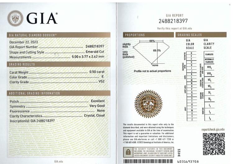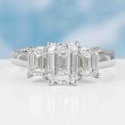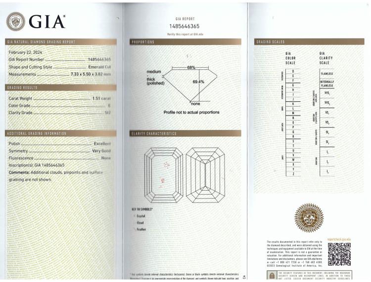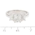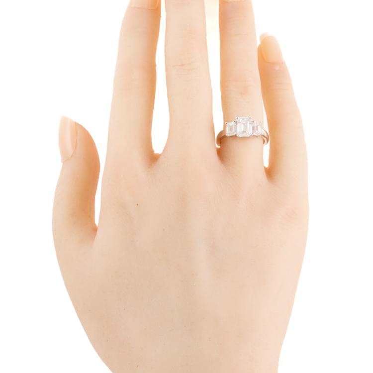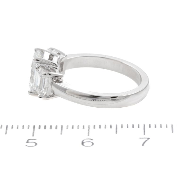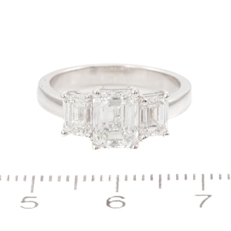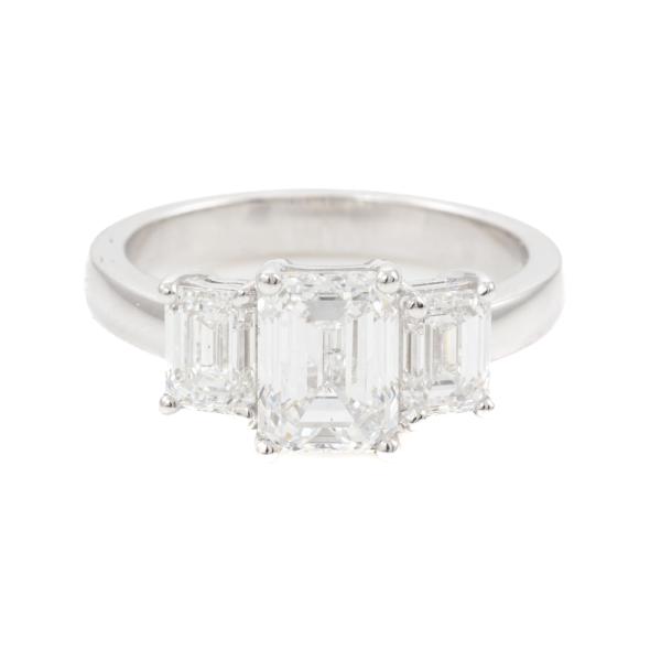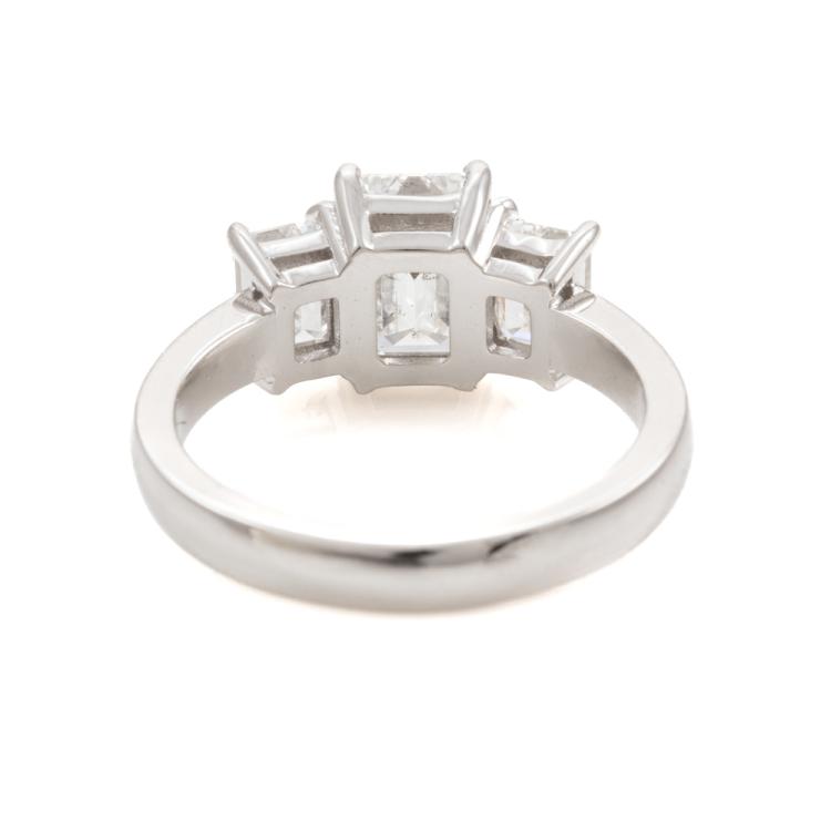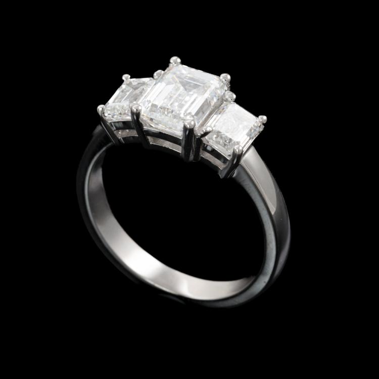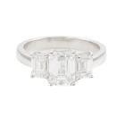 Diamond trilogy ring with centre emerald cut natural Diamond of 1.51ct (with GIA Summary Reports graded as E SI2 #1485646365) and 2 side emerald cut natural Diamonds totalling 1.00ct (with GIA Summary Reports graded as E VS2 #2488218397, 7481397362). Platinum 950. Ring size K. Band width: 2.6mm. Weight: 6.6g. (New)