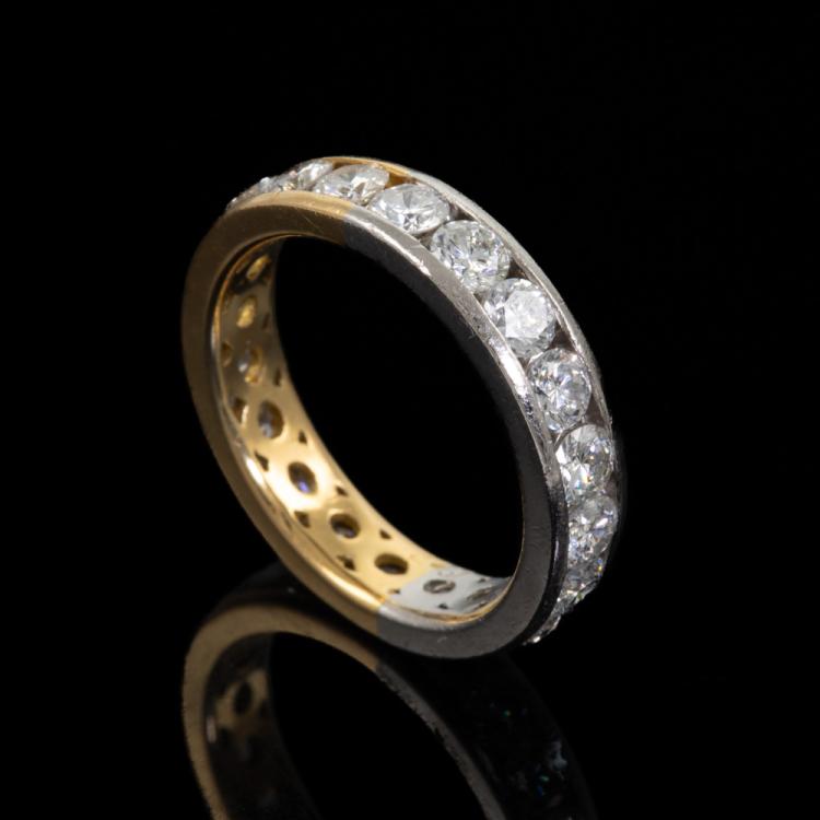 Diamond two-tone full eternity ring with round Natural Diamonds totalling 2.57ct (Estimated grading: H SI). 18ct yellow gold and platinum 900. Ring size L1/2 - ring resizing is not recommended. Band width: 4.5mm. Note - ring band with visible joint lines. Weight: 5.7g. With Valuation Certificate 418374. (Pre-owned)