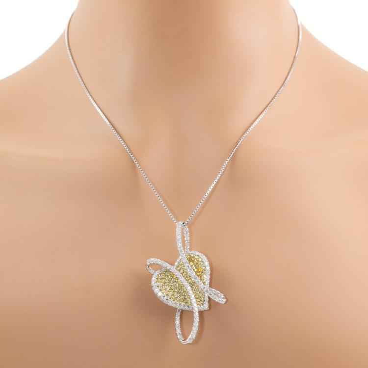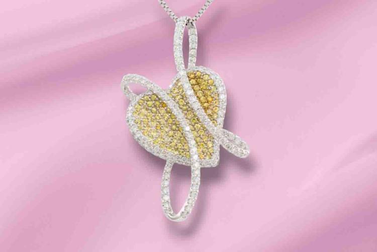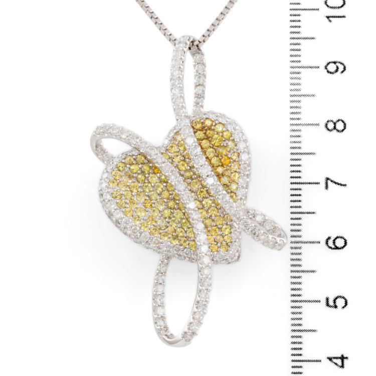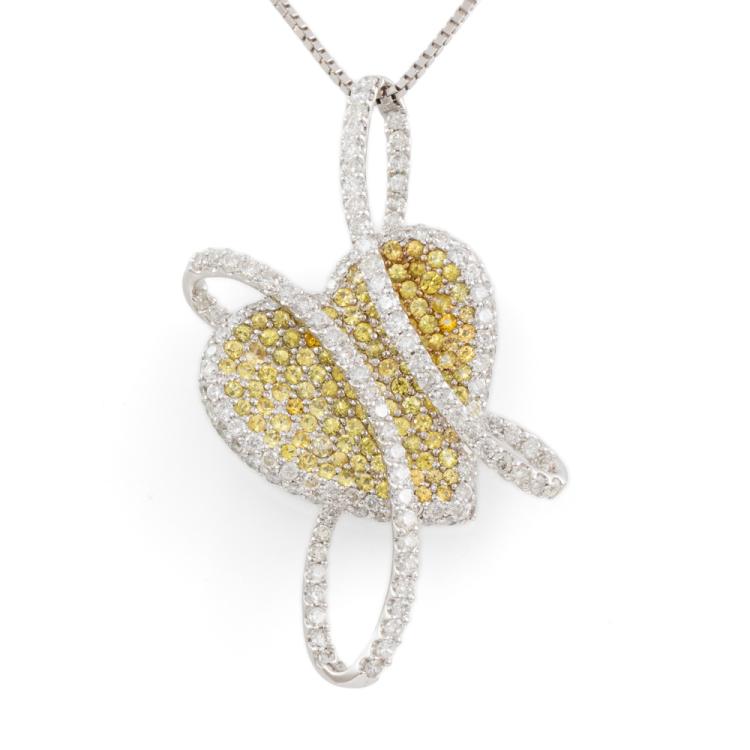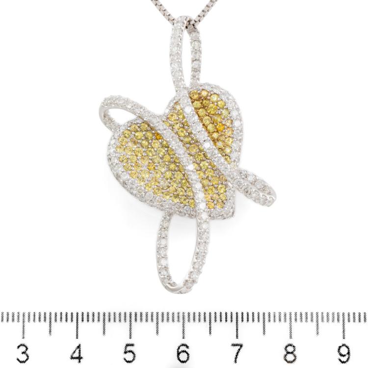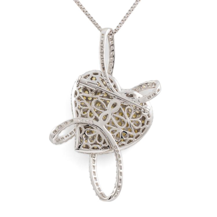 Sapphire and Diamond heart designed brooch/pendant with round natural yellow Sapphires totalling 2.85ct and round natural Diamonds totalling 3.25ct (Estimated grading: H SI-P1). 18ct white gold with 44cm 18ct white gold adjustable chain. Pendant size: approx. 53 x 30mm. Weight:18.0g. With Certificate #418585. (Pre-owned)