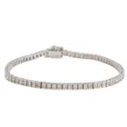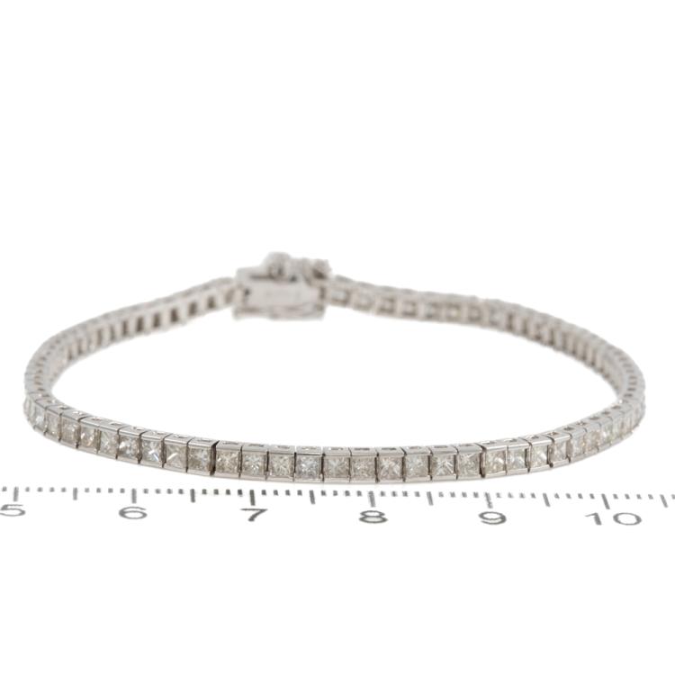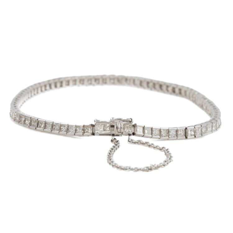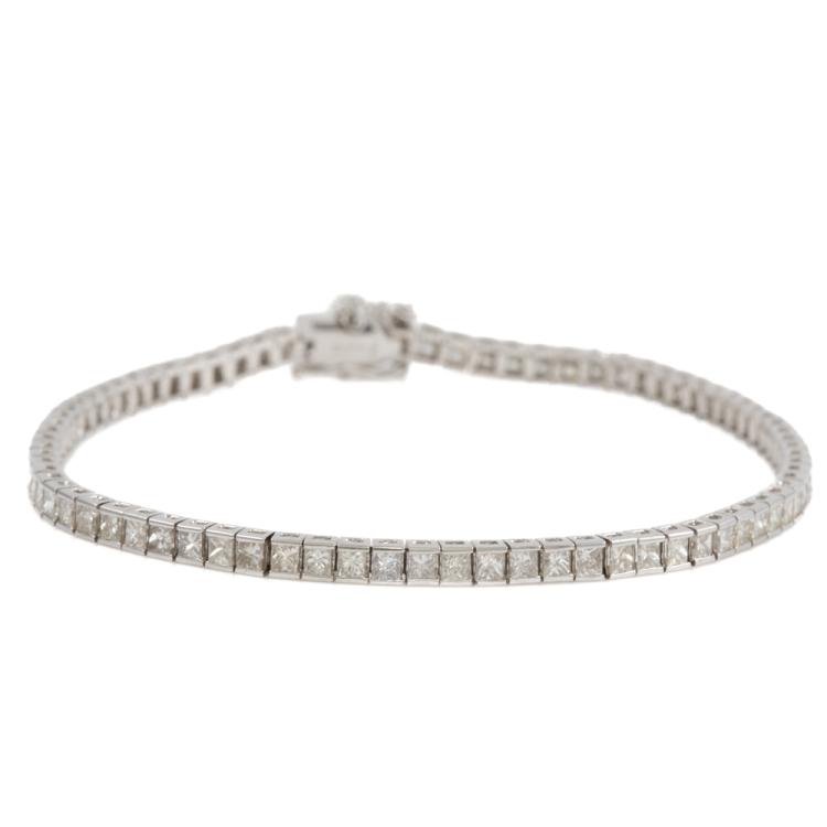 Diamond tennis bracelet with 79 princess cut Natural Diamonds totalling 3.00ct (Estimated grading: J SI). Platinum 850. Length: 18cm. With safety chain. Weight: 10.4g. With Valuation Certificate #418973. (Pre-owned)