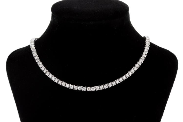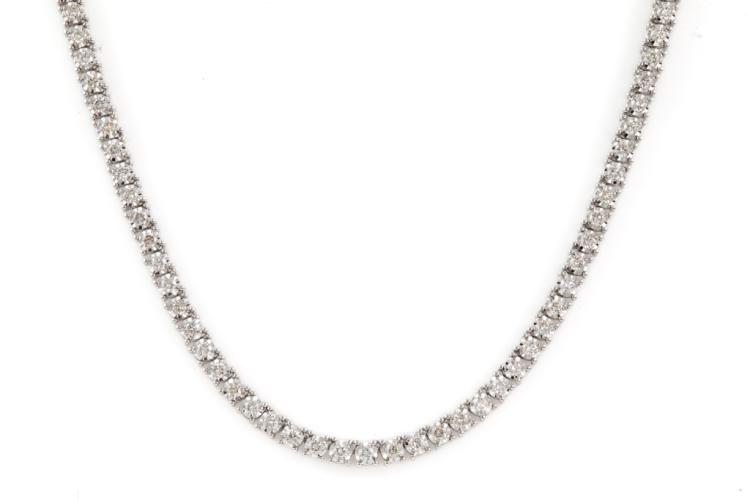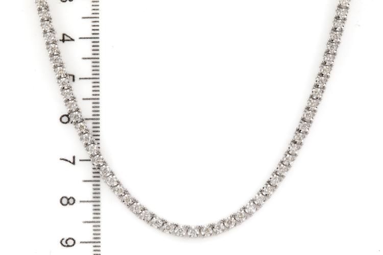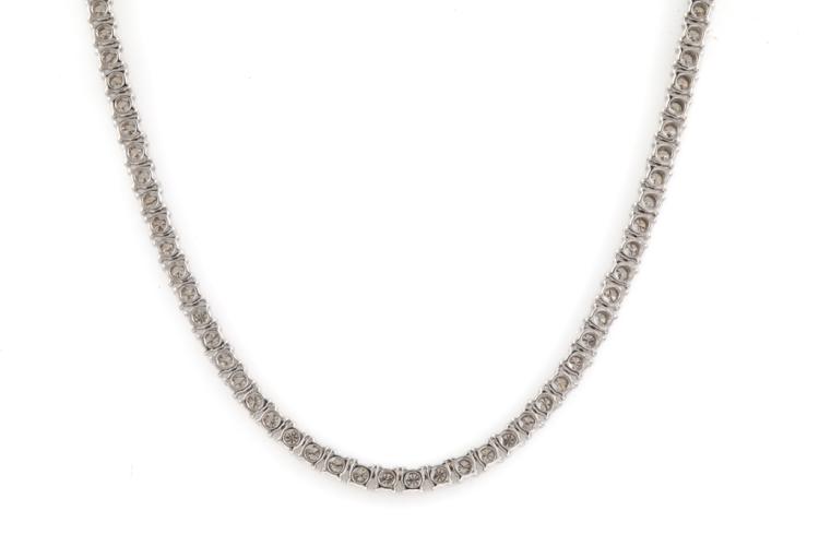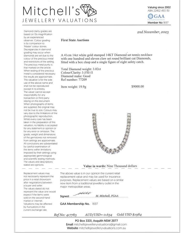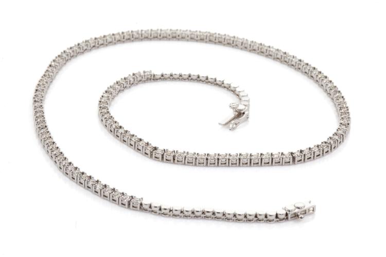 Diamond tennis necklace with 111 round shape Natural Diamonds totalling 3.02ct (Estimated grading: I-J SI-P1). 14ct white gold. Length: 41cm. Diamonds extend 32cm of the necklace. Weight: 19.9g. With Valuation Certificate #417783. (New)