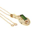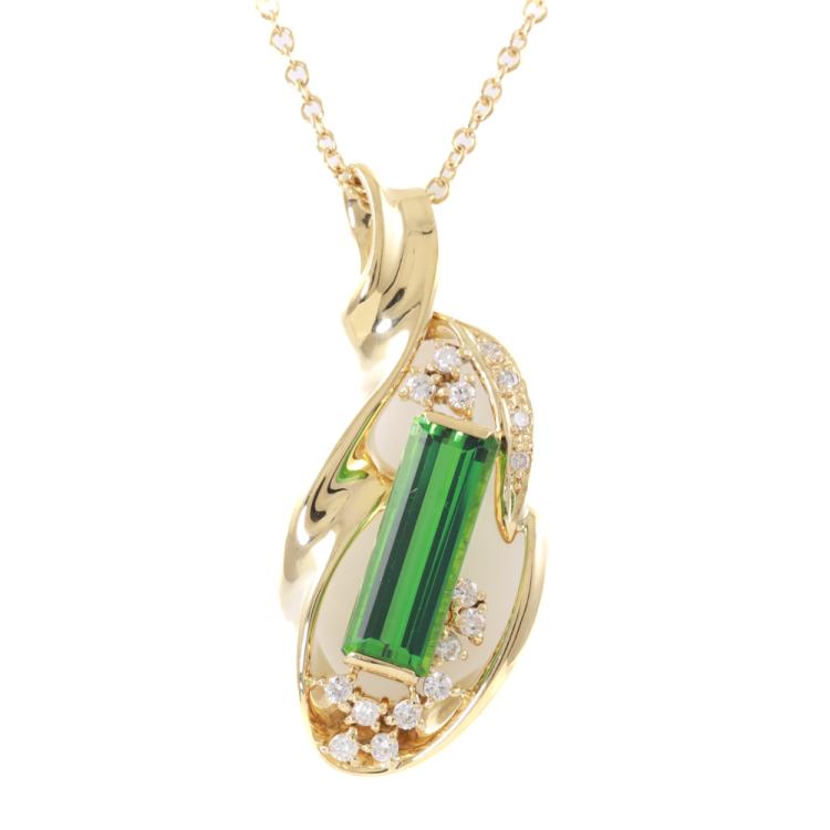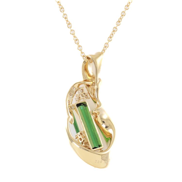 Tourmaline and Diamond pendant with centre baguette cut green Natural Tourmaline totalling approximately 3.38ct and round Natural Diamond totalling 0.26ct. 18ct yellow gold with 45.0cm 18ct yellow gold chain. Weight:
