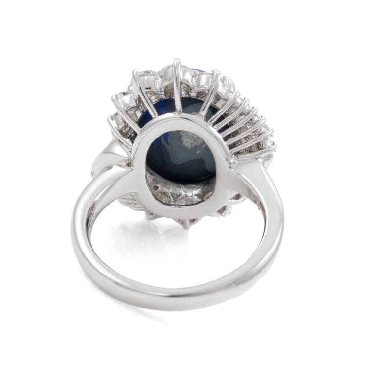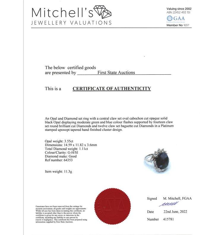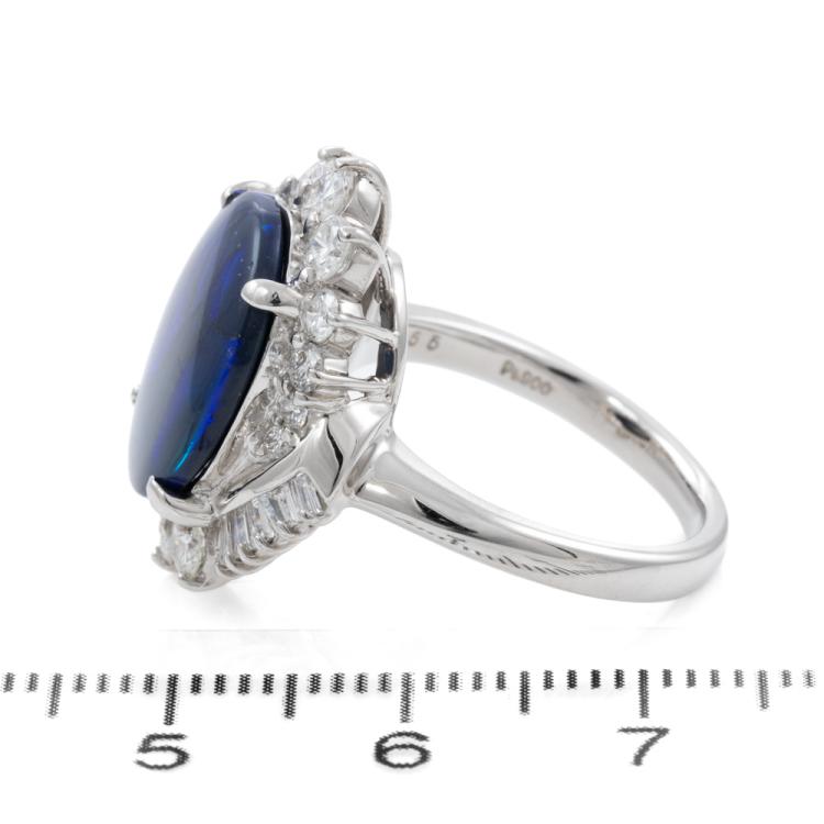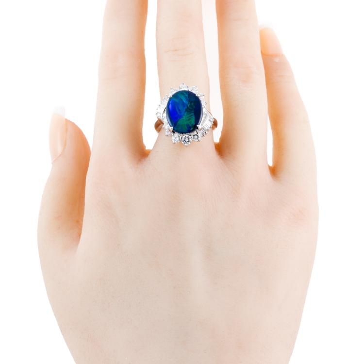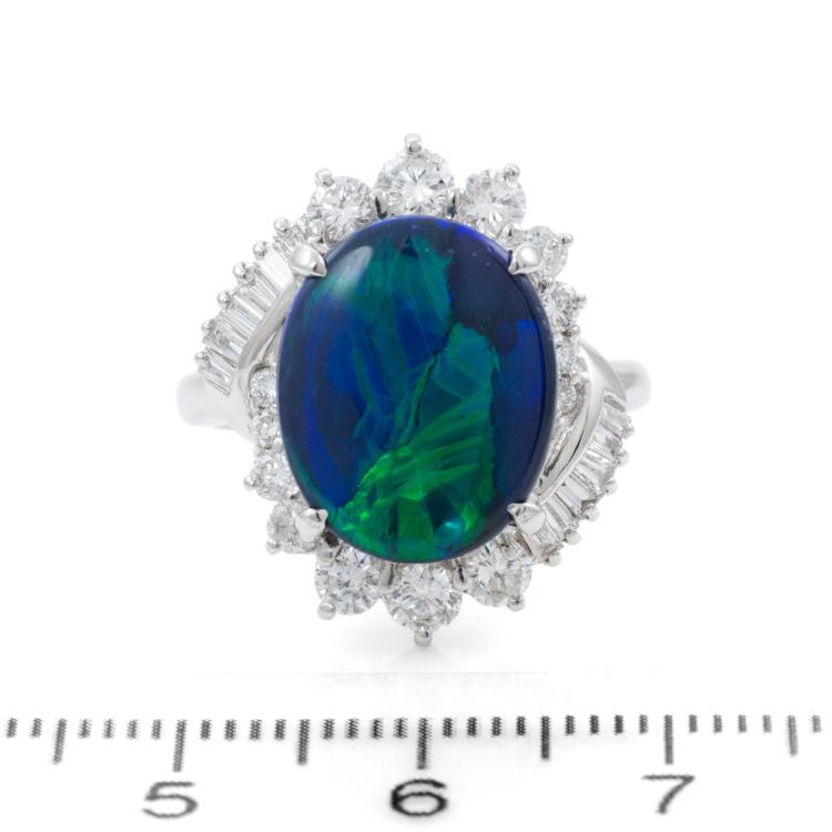 Opal and Diamond ring with an oval cabochon cut solid Black natural Opal of 3.55ct (note very minor surface wear on stone) and round & baguette cut Diamonds totalling 1.11ct (Estimated grading: G-H SI). Platinum-900. Ring size: L1/2. Weight: 11.3g. With certificate #415781. (Pre-owned)
