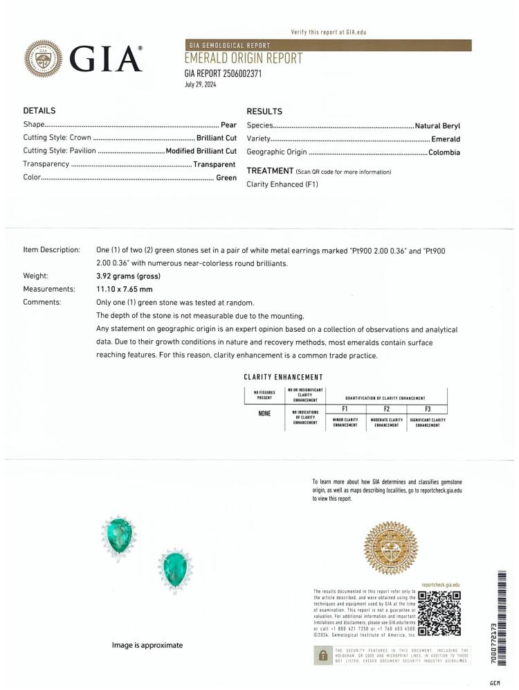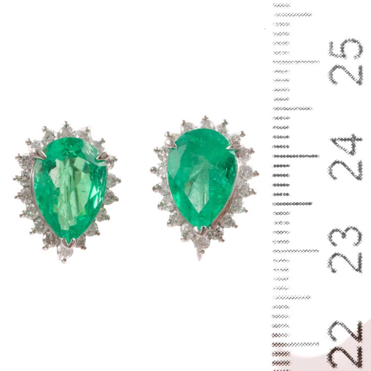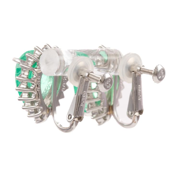 Emerald and Diamond screwback clipped on earrings with pear shape Columbian Natural Emeralds totalling 4.00ct (With GIA Report # 2506002371, only one Emerald tested at random) and round Natural Diamonds totalling 0.72ct (Estimated grading: G SI-P1). Platinum-900. Weight: 7.9g. (Pre-owned)