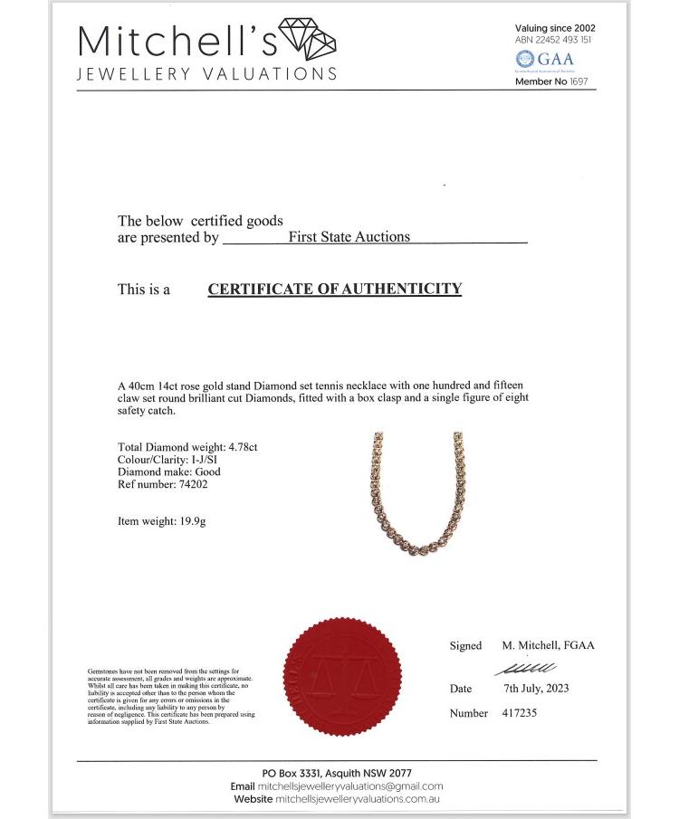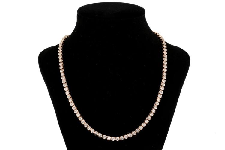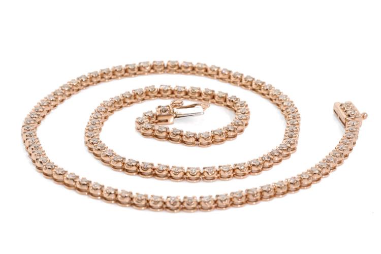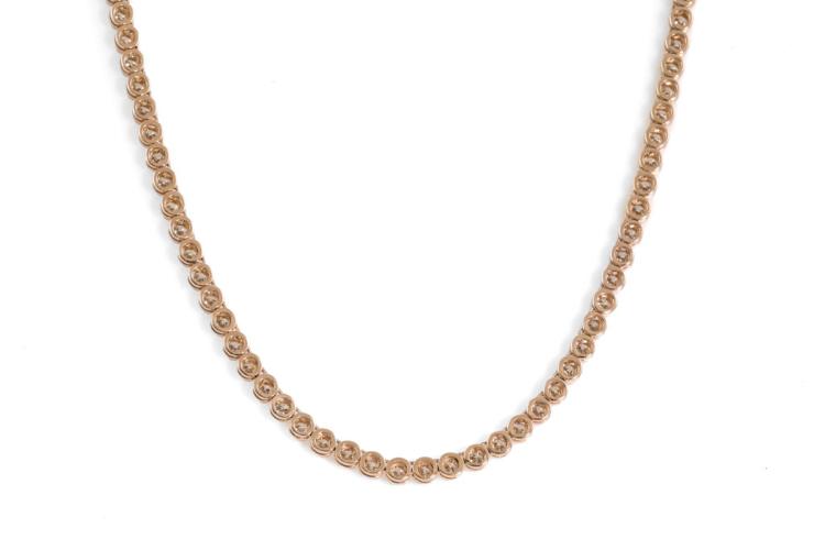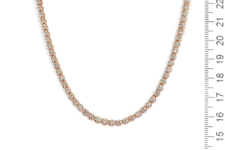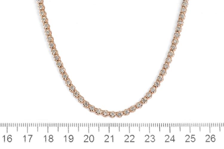 Diamond tennis necklace with 115 round natural Diamonds totalling 4.78ct (Estimated grading: I-J SI). 14ct rose gold. Length: 40cm. Weight: 19.9g. With certificate #417235. (New)