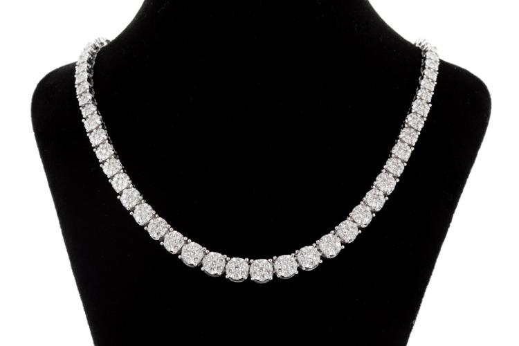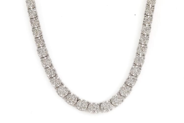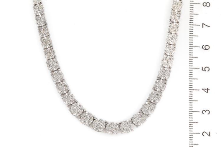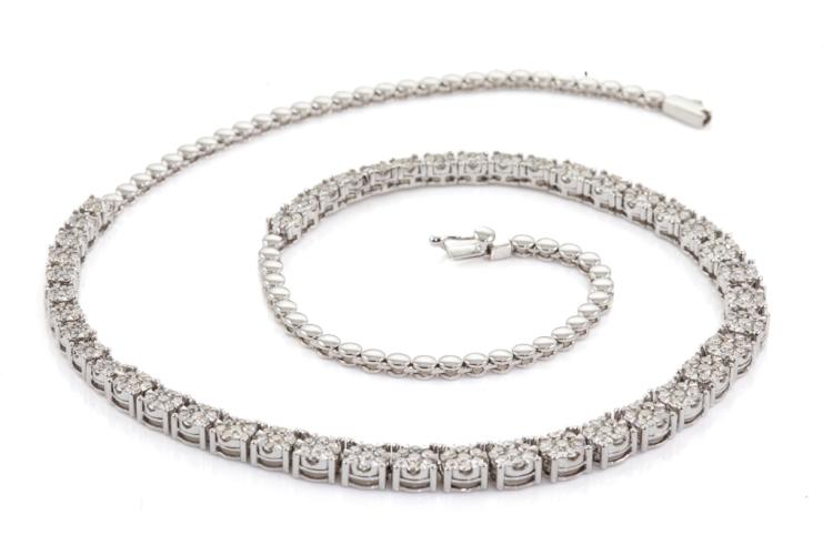 Diamond necklace with 315 round Natural Diamonds totalling 5.02ct (Estimated grading: I-J SI-P1), invisibly set, each link is set with 7 diamonds. 14ct white gold. Length: 42cm. Diamonds extend 22.8cm of the necklace. Weight: 27.4g. With Valuation Certificate #417784. (New)