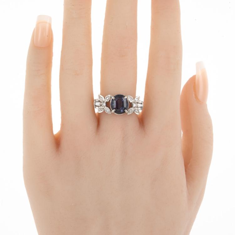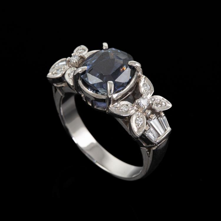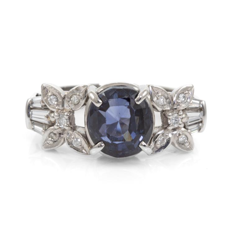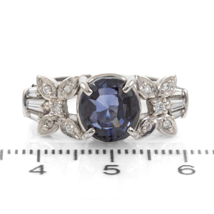Sapphire and Diamond ring with oval shape Unheated Madagascar natural blue Sapphire of 5.05ct and round & baguette cut natural Diamonds totalling 0.25ct. Platinum 900. Ring size N. Band width: 3.2mm - 4.4mm. Weight: 8.9g. With GIA Report #6485106632. (Pre-owned)