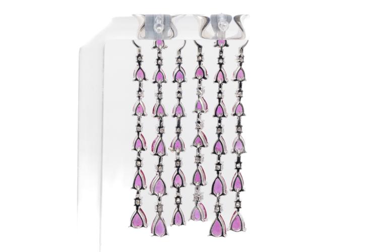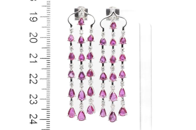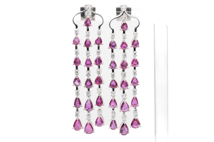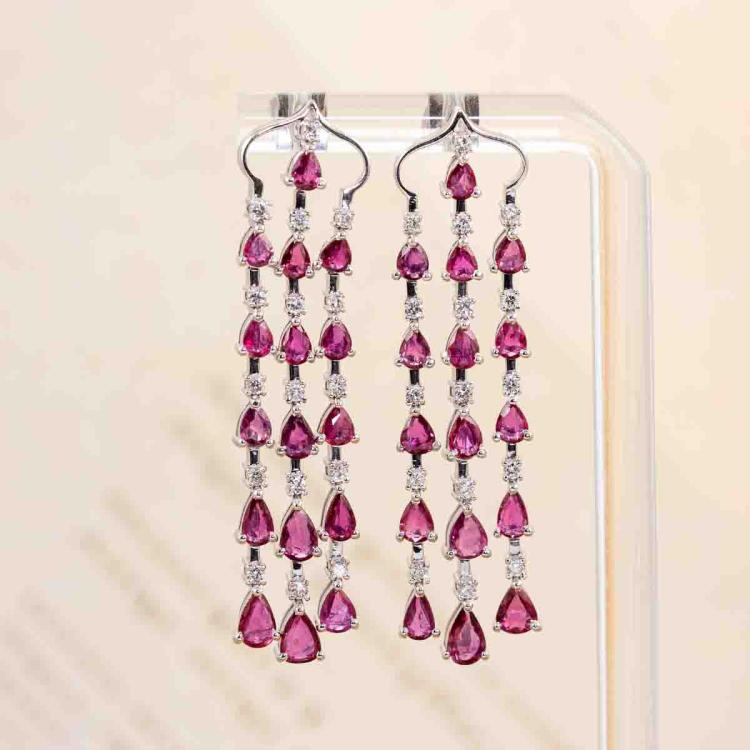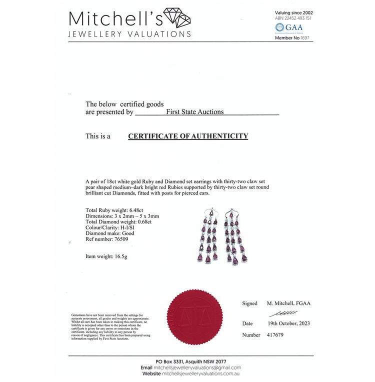 Ruby and Diamond earrings with Ruby totalling 6.48ct and Diamonds totalling 0.68ct (Estimated grading: H SI). 18ct white gold. Weight: 16.5g. With certificate#417679 . (Pre-owned)