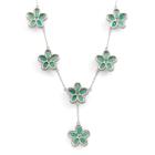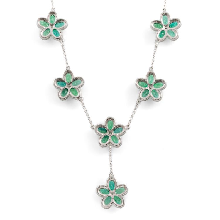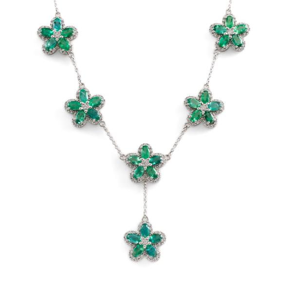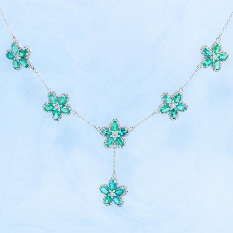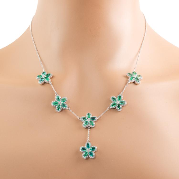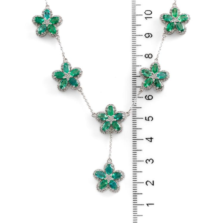 Emerald and Diamond floral motifs necklace with oval shape Natural Zambian Emeralds totalling 6.78ct and round natural Diamonds totalling 1.37ct (Estimated grading: G-H VS-SI). 14ct white gold. Adjustable Length: 43.5cm - 45.0cm. Weight: 12.6g. with GSL Description #AA69494/5. (As New)