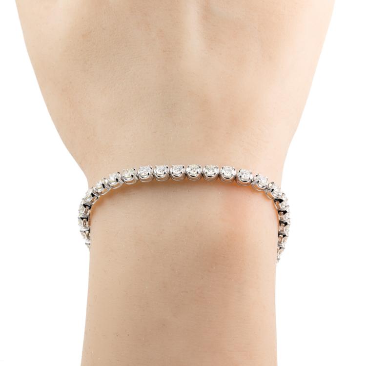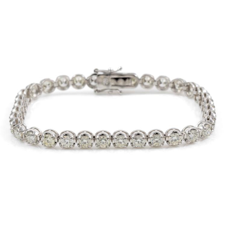 Diamond tennis bracelet with 35 round brilliant cut Natural Diamonds totalling 6.79ct. (Estimated grading: I-J SI) 18ct white gold. Length: 18cm. Weight: 12.8g. With Valuation Certificate #418076. (New)