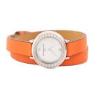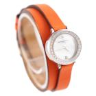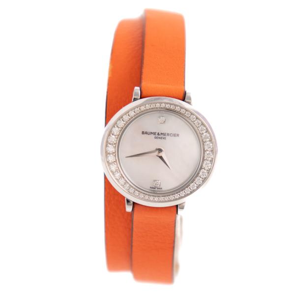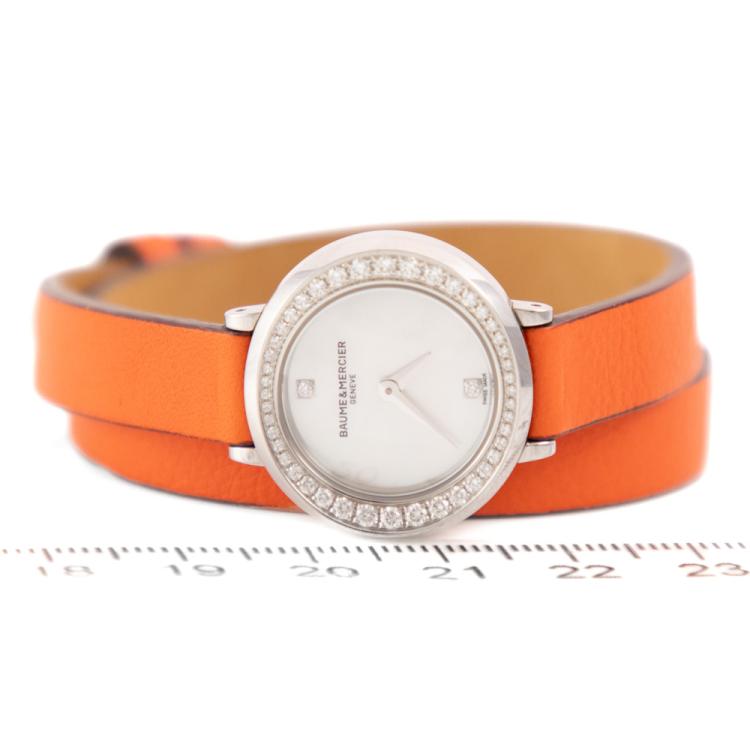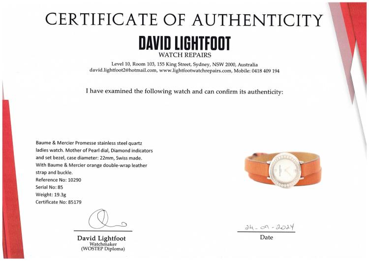 Baume & Mercier Promesse stainless steel quartz ladies watch. Mother of Pearl dial, Diamond indicators and set bezel, case diameter: 22mm, strap length including case: 35mm, Swiss made. Ref# 10290. With Baume & Mercier orange double-wrap leather strap and buckle. With Certificate of Authenticity. 3 month FSA warranty (Pre-owned)