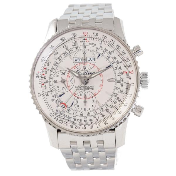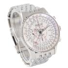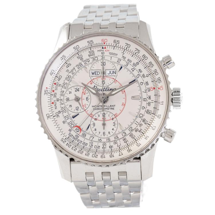 Breitling Navitimer Montbrillant Datora stainless steel automatic mens watch. Ivory chronograph dial, date, case diameter: 43mm, wrist size: 19.5cm, Swiss made. Ref# A21330. With Breitling stainless steel bracelet and clasp. With Certificate of Authenticity and Breitling box with Breitling case inside. 3 month FSA warranty applies. (Pre-owned)