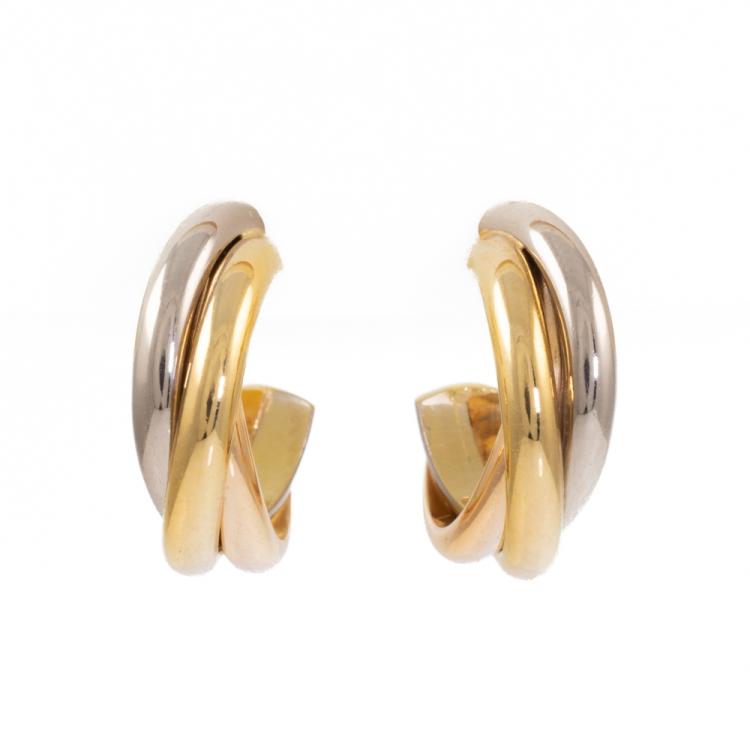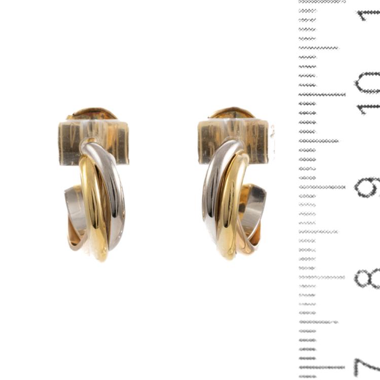 Cartier Trinity Earrings. 18ct yellow, rose & white gold with 18ct yellow gold La Pousette backs. Width 4mm. Inner diameter: 10mm. Circa 1997. Weight: 5.2g. (Pre-owned)