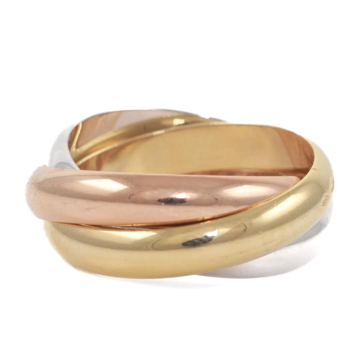 Cartier Trinity ring. 18ct yellow, rose & white gold. Cartier stamped size 55, actual ring size O - ring resizing is not recommended. Individual band width: 4mm. Circa: 1997. Weight: 11.9g. With Cartier Box. (Pre-owned)