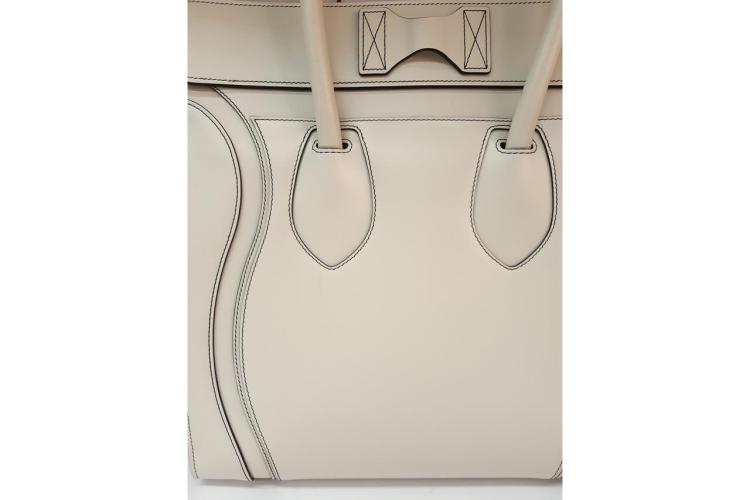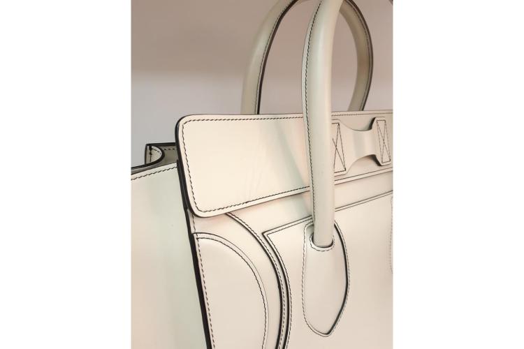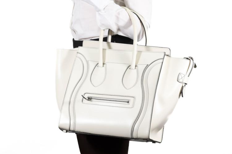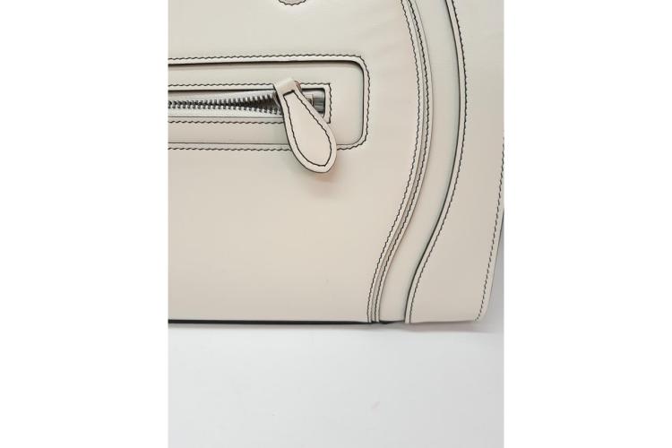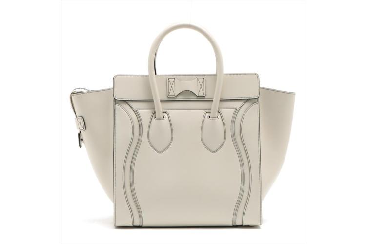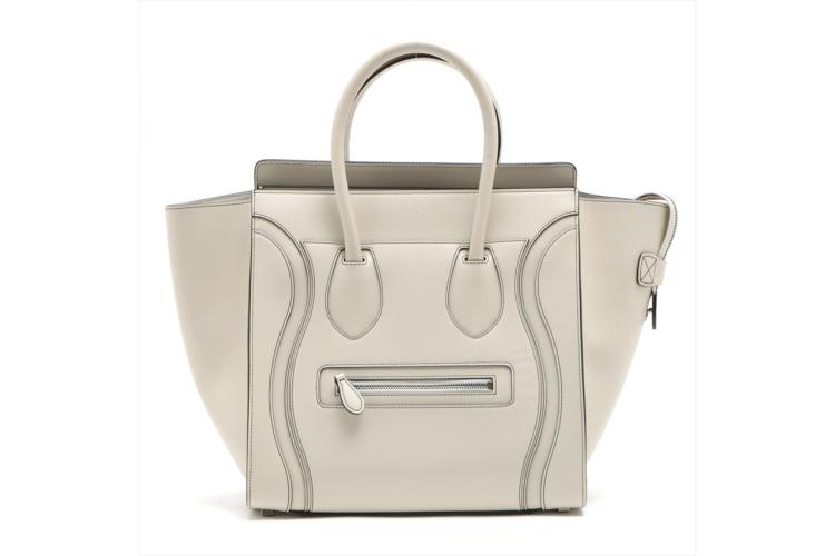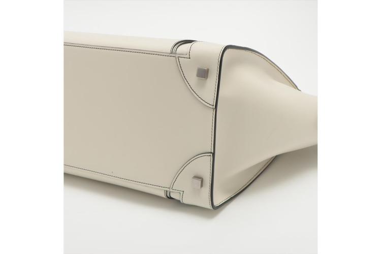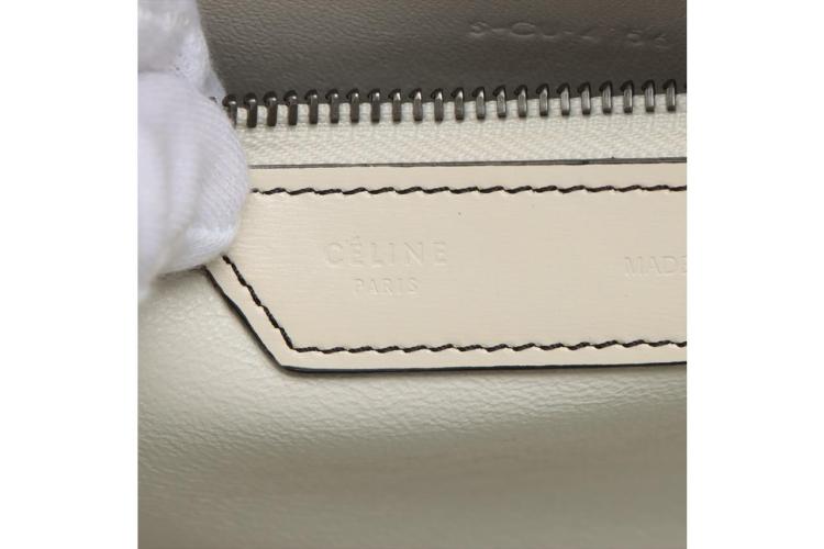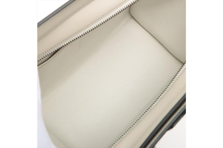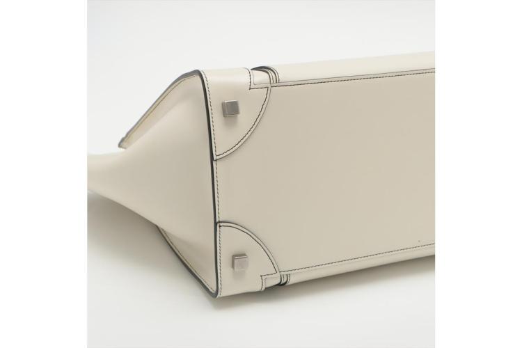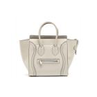 Celine Mini luggage tote in beige leather. Featuring silver/metal-toned hardware, dual leather top handles, expandable sides, a front zipped pocket and zipped closure on top. The top opens to beige leather lining interior with zipper and patch pockets. Approximate dimensions: 31cm(L) x 31cm(H) x 17.5cm(D), 13cm handle drop. Accompanied by purchase receipt dated 02/10/17 and Celine dust bag. With Entrupy Certificate of Authenticity. (Pre-owned)