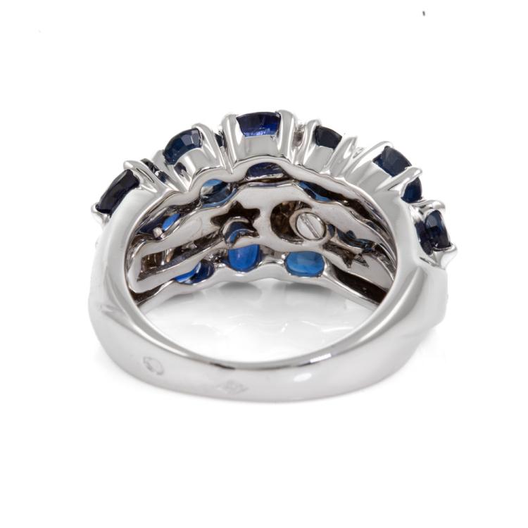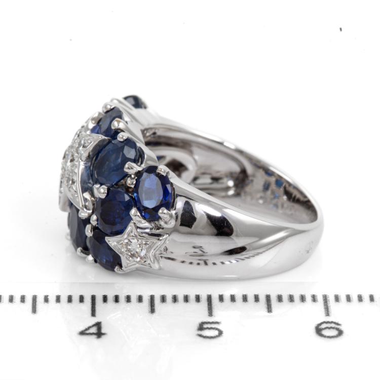 Chanel Comète Sapphire & Diamond ring with round & oval shape Natural blue Sapphire totalling approximately 4.00cts and round Natural Diamonds totalling approximately 1.00cts (Estimated grading: G VS). 18ct white gold. Ring size M- ring resizing is not recommended. Band width: 3mm - 8.6mm. Weight: 13.1g. With Chanel polishing receipt dated 10/04/24 and Chanel box and polishing cloth. (Pre-owned)