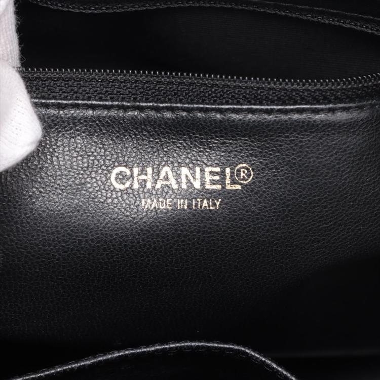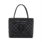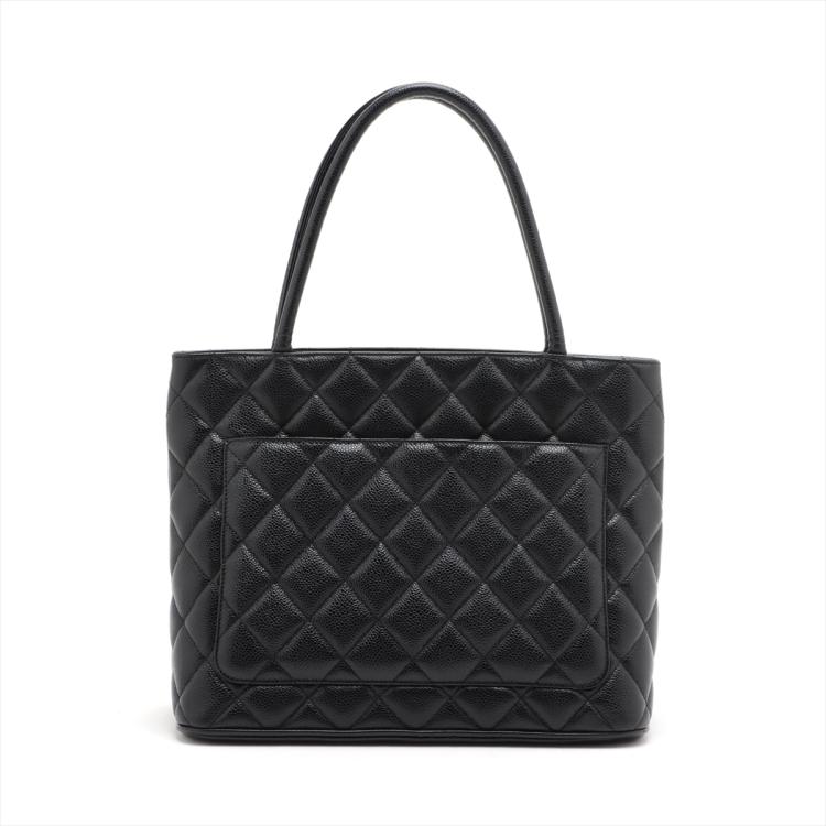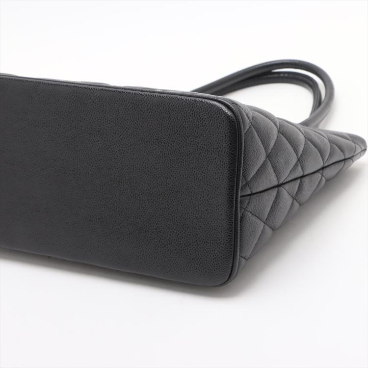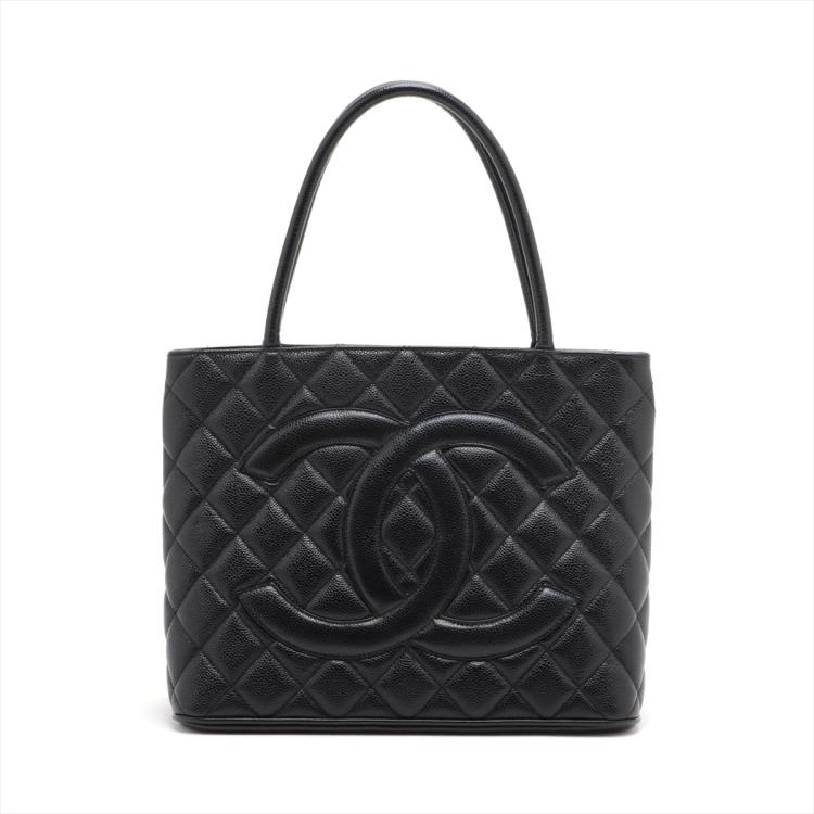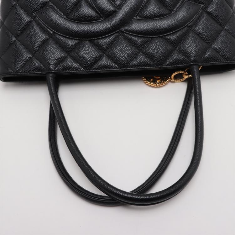 Chanel Medallion tote bag in black diamond-quilted caviar leather. Featuring gold-toned hardware, exterior rear patch pocket, stitched CC logo at front, and rolled leather handles. The zipper with a CC logo detail plate closure opens to a black leather lining with zipper and patch pockets. Approximate dimensions: 29.5cm(L) x 23.5cm(H) x 14.5cm(D), handle drop 16cm. Accompanied by Chanel dustbag. With Entrupy Certificate of Authenticity. (Pre-owned)