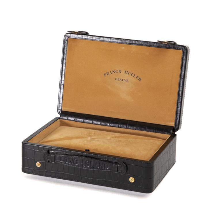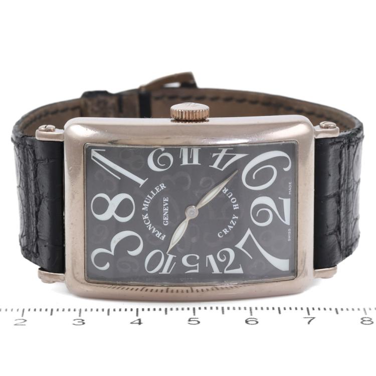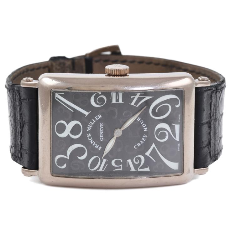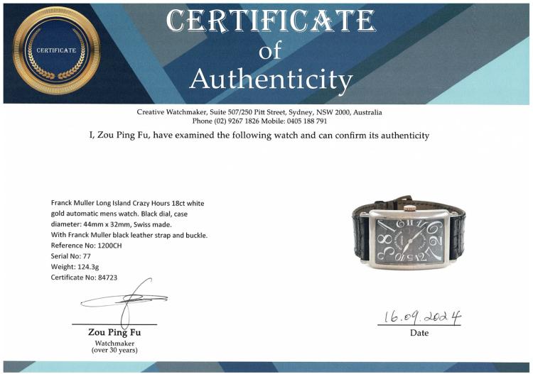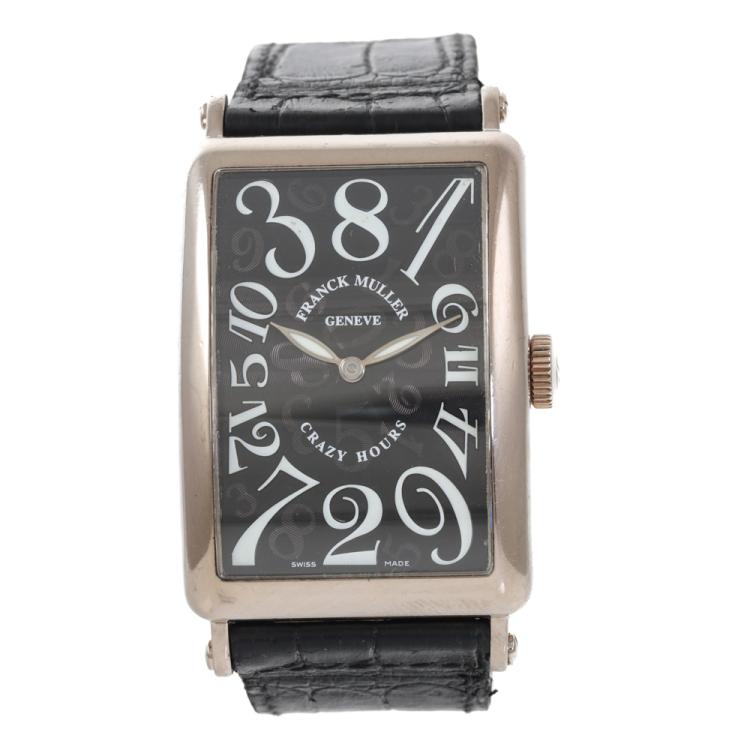 Franck Muller Long Island Crazy Hours 18ct white gold automatic mens watch. Black dial, case diameter: 44mm x 32mm, strap length: 19.5cm, Swiss made. Ref# 1200CH. With Franck Muller black leather strap and buckle. With Certificate of Authenticity, Franck Muller Certificate of Origin & Warranty dated 24/11/2003 and Franck Muller box. 3 month FSA warranty. (Pre-owned)