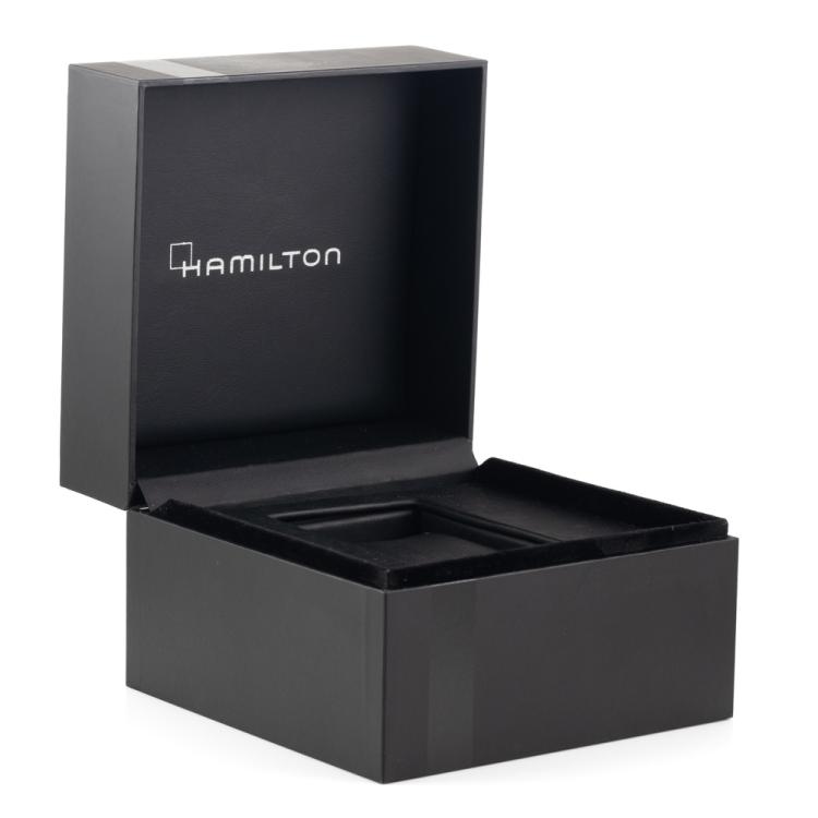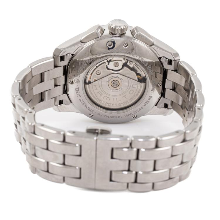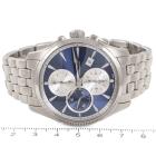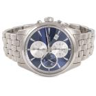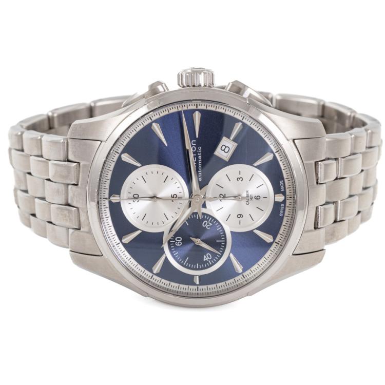 Hamilton Jazzmaster stainless steel automatic mens watch. Blue chronograph dial, date, case diameter: 42mm, wrist size: 20.5cm, Swiss made. Ref# H325961. With Hamilton stainless steel bracelet and clasp. With Certificate of Authenticity, Undated Hamilton 2 year International Warranty card and Hamilton box. 3 month FSA warranty (Pre-owned).