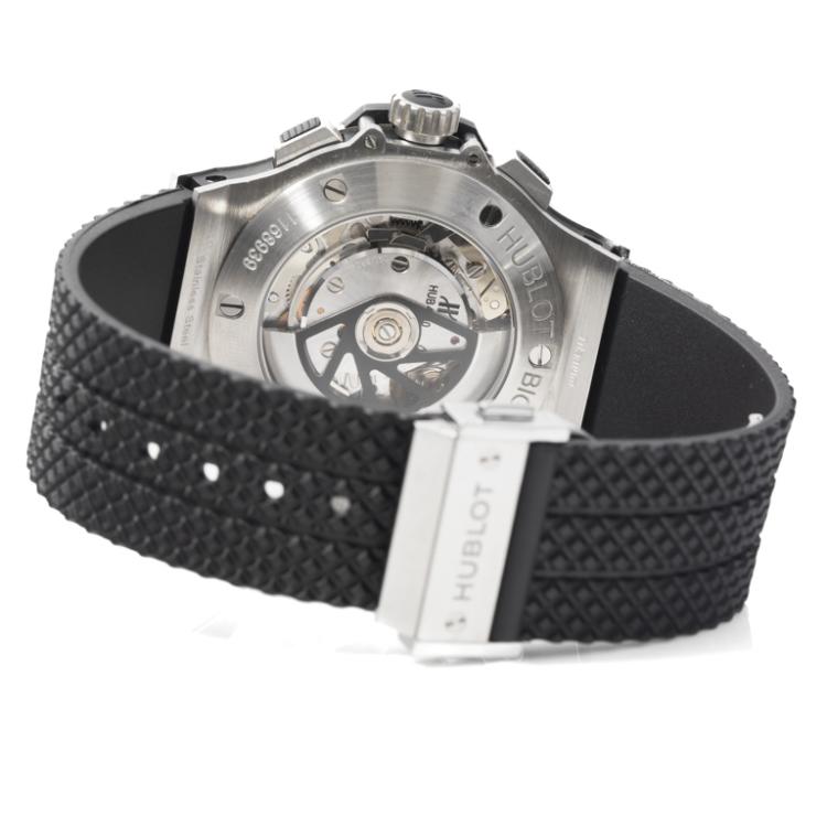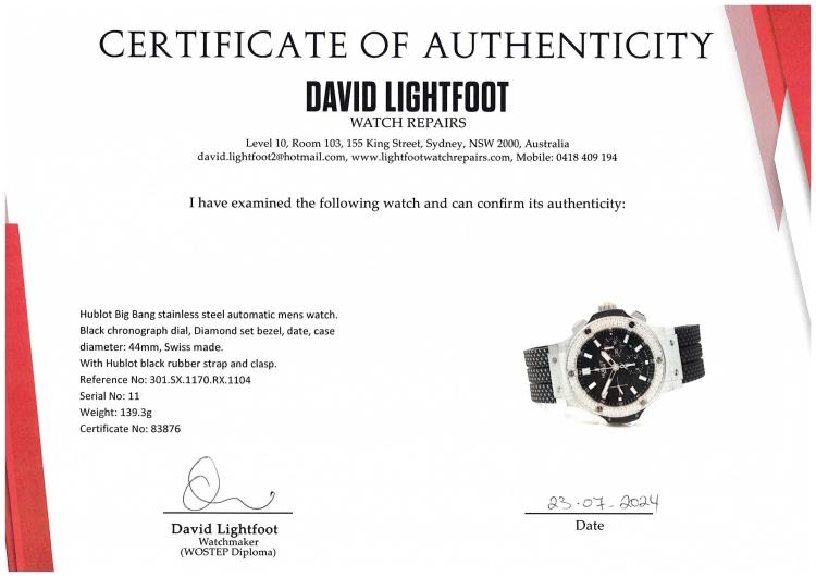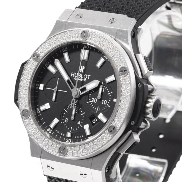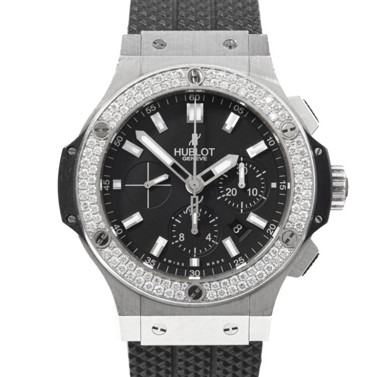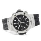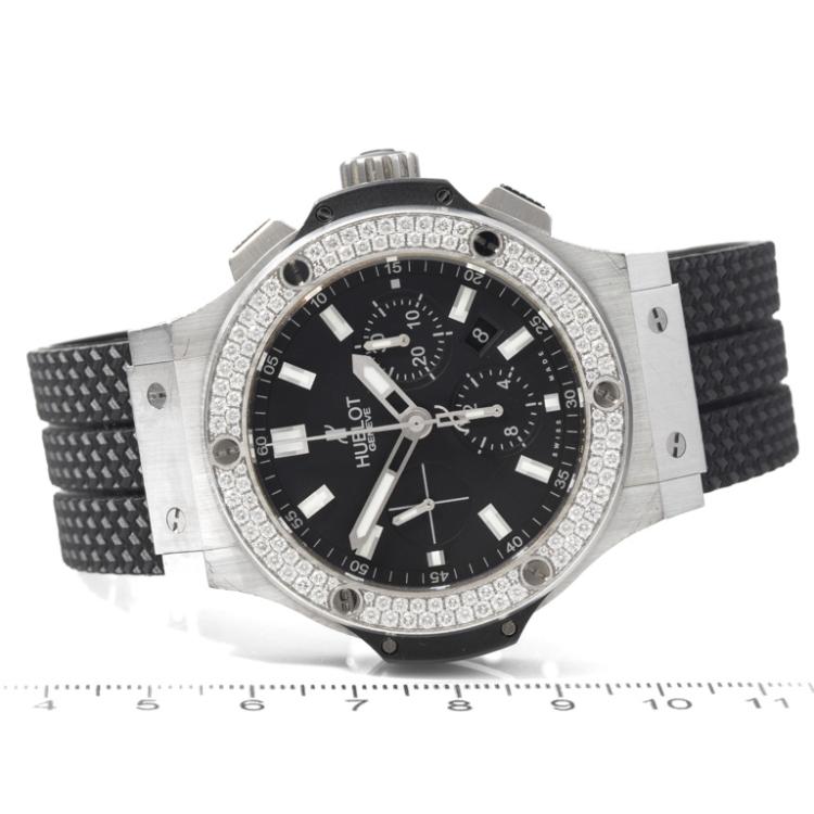 Hublot Big Bang stainless steel automatic mens watch. Black chronograph dial, Diamond set bezel, date, case diameter: 44mm, adjustable max wrist size: 20.5cm, Swiss made. Ref# 301.SX.1170.RX.1104. With Hublot black rubber strap and clasp. With Certificate of Authenticity, Undated Hublot International Warranty Card and Hublot box. 3 month FSA warranty. (Pre-owned)