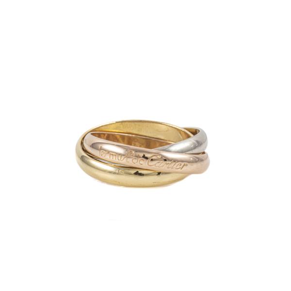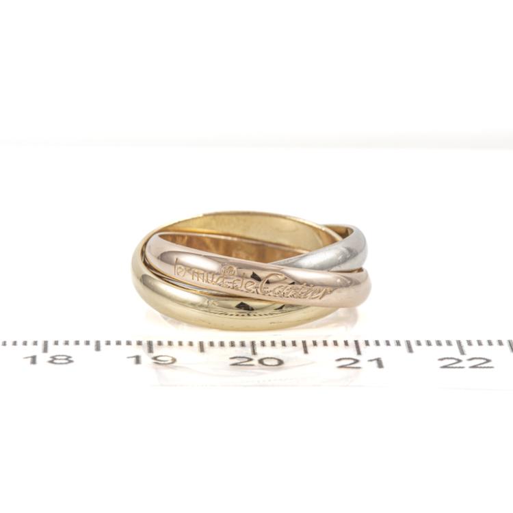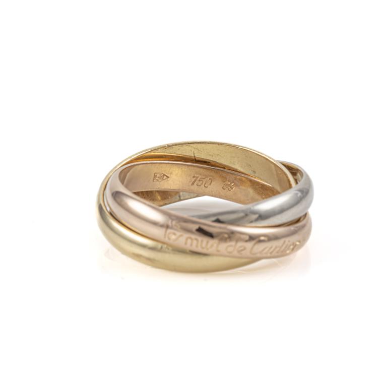 Le Must De Cartier Trinity ring, medium model. 18ct yellow, rose and white gold. Cartier stamped size 59, actual ring size R - ring resizing is not recommended. Individual band width: 3.5mm. Weight: 10.1g. (Pre-owned)