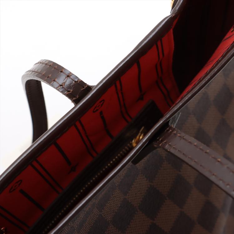 Louis Vuitton Neverfull MM tote in Damien Ebene coated canvas with natural brown cowhide trim. Featuring gold-toned hardware, side laces, and double flat leather handles. The hook closure opens to a red striped textile lining with a zipper pocket. Approximate dimensions: 31.5cm(L) x 28.5cm(H) x 16cm(D), handle drop 16cm. With Entrupy Certificate of Authenticity. (Pre-owned)