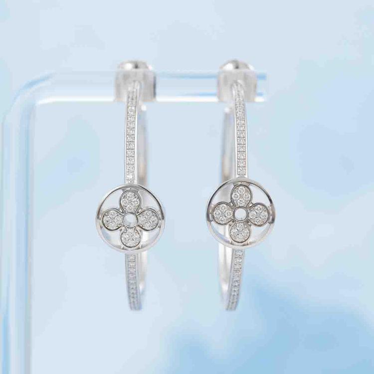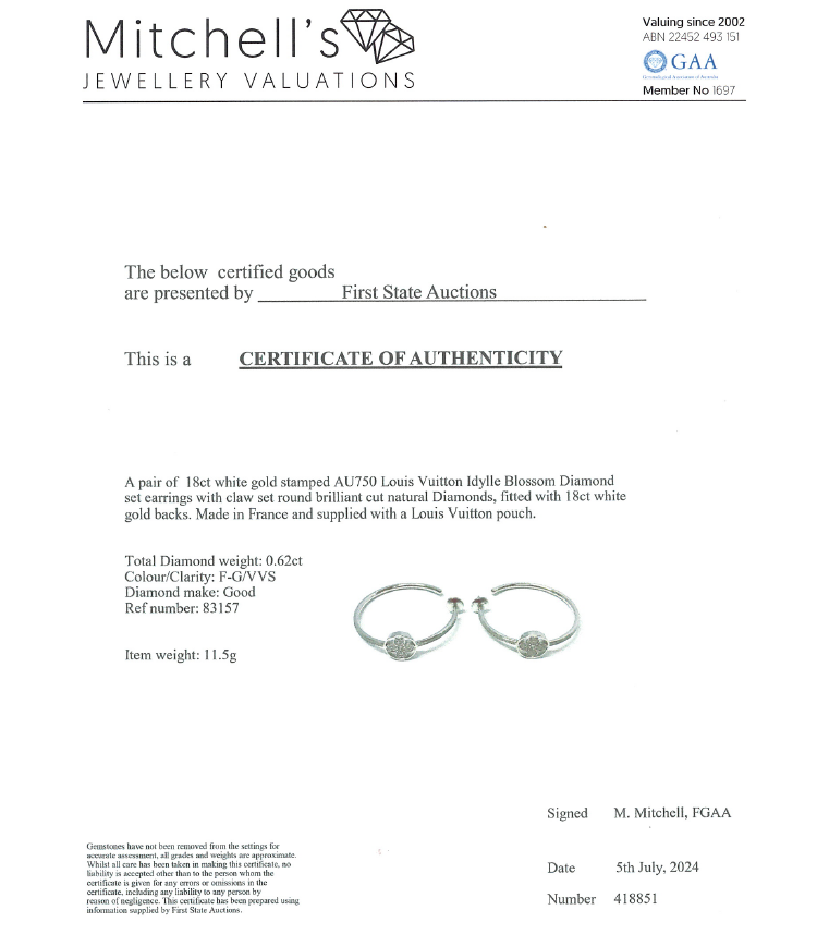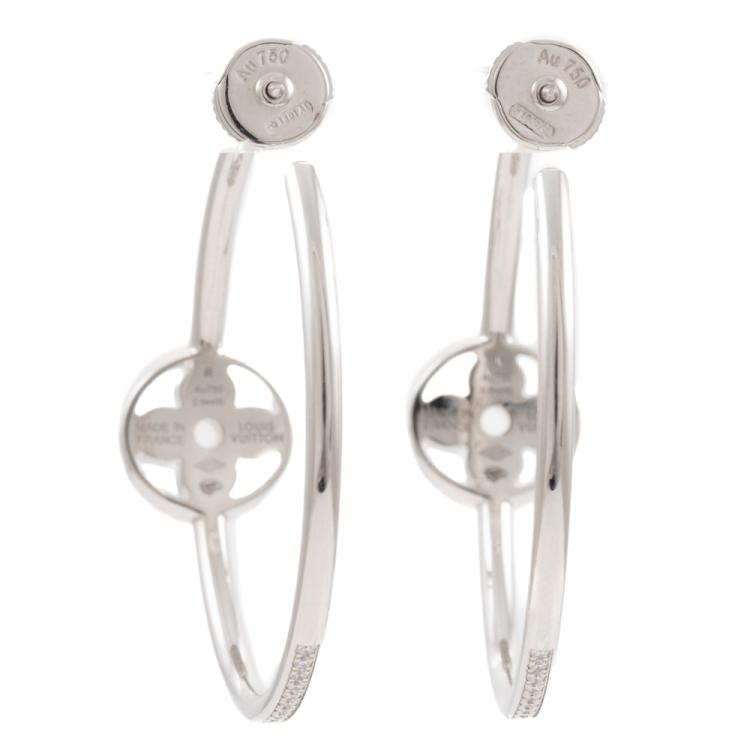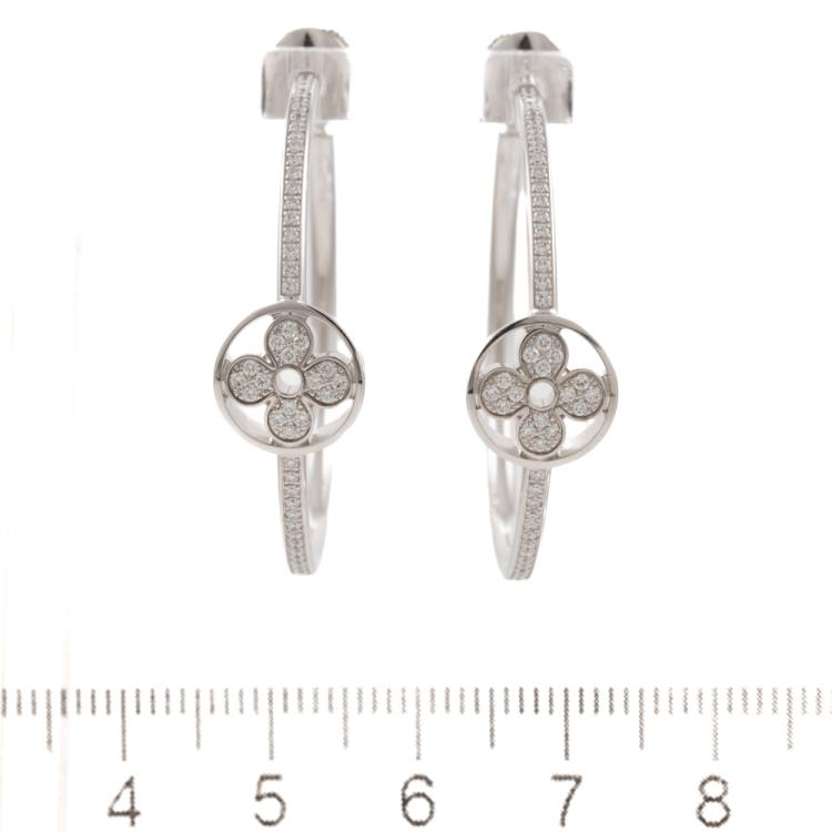 Louis Vuitton Idylle Blossom hoop earrings with round natural Diamonds totalling 0.62ct (Estimated grading: F-G VVS). Diameter: 35 mm. 18ct white gold with 18ct white gold secure backs. Made in France. Weight: 11.5g. With Louis Vuitton pouch. With Certificate #418851. (Pre-owned)