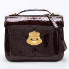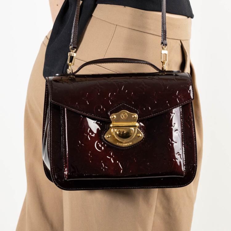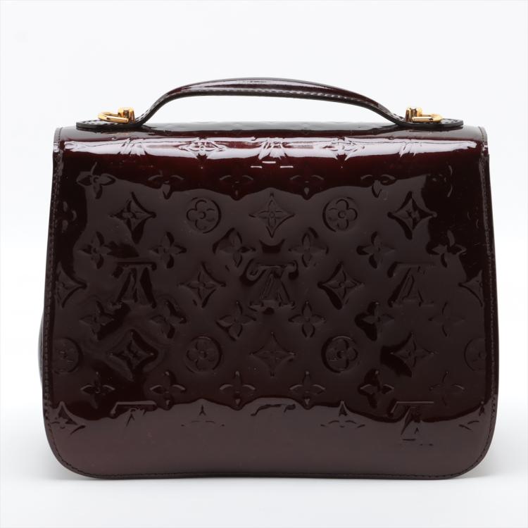 Louis Vuitton Mirada in Amarante monogram embossed vernis leather. Featuring gold-toned hardware, detachable shoulder strap, and patch pocket under top flap. The push-lock closure opens to a brown textile interior with a patch pocket. Approximate dimensions: 26.5cm(L) x 20cm(H) x 10.5cm(D), shoulder strap drop 51cm, handle drop 2.5cm. Accompanied by a LV handkerchief. With Entrupy Certificate of Authenticity. (Pre-owned)