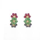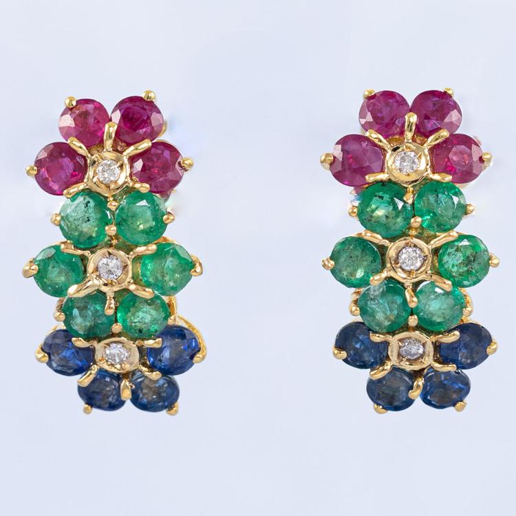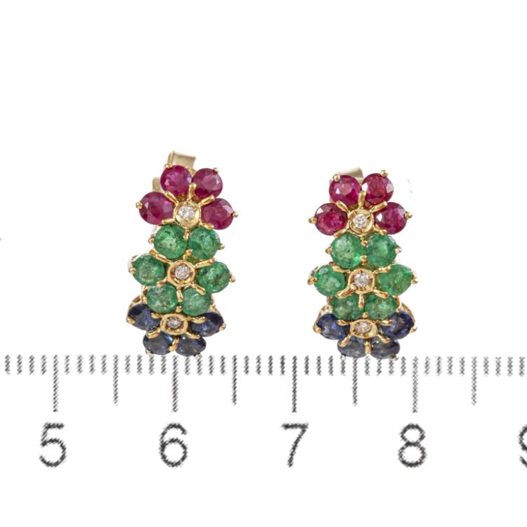 Mixed Gemstones and Diamond earring with round Natural blue Sapphires totalling approximately 0.64ct, round Natural Rubies totalling approximately 0.64ct, round Natural Emeralds totalling approximately 0.72ct and Natural Diamonds totalling 0.05ct. 18ct yellow gold with 18ct yellow gold backs. Length: 16.6mm. Weight: 4.1g. (Pre-owned)