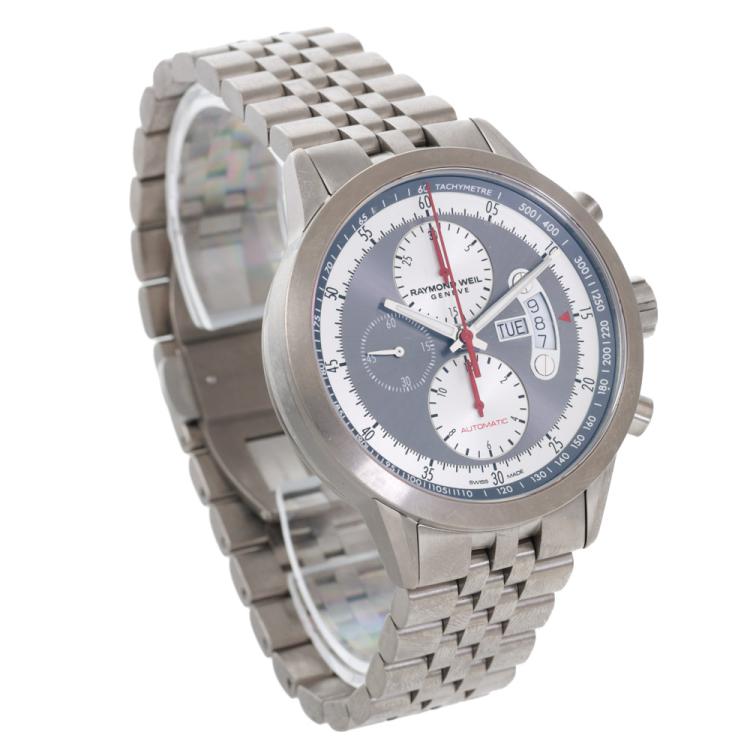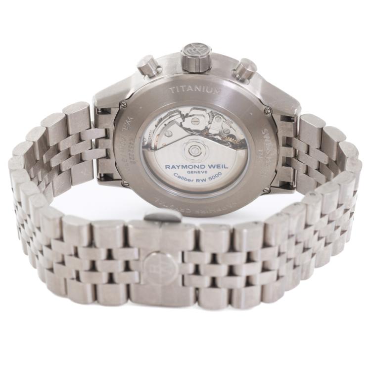 Raymond Weil Freelancer titanium automatic mens watch. Grey chronograph dial, day & date, case diameter: 45mm, wrist size: 21.1cm, Swiss made. With Raymond Weil titanium bracelet & clasp. Ref# 7745-TI-05659. With Certificate of Authenticity and Raymond Weil box. (Pre-owned)