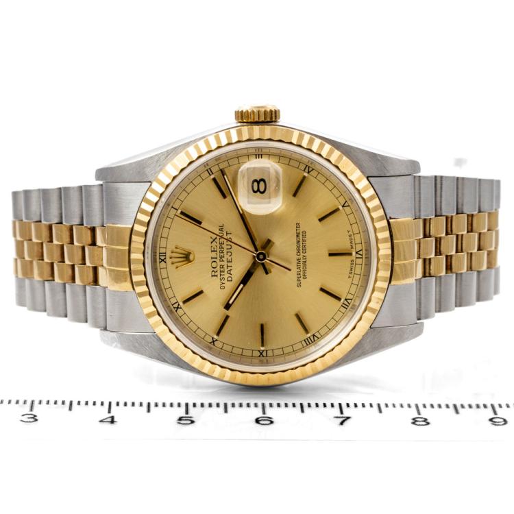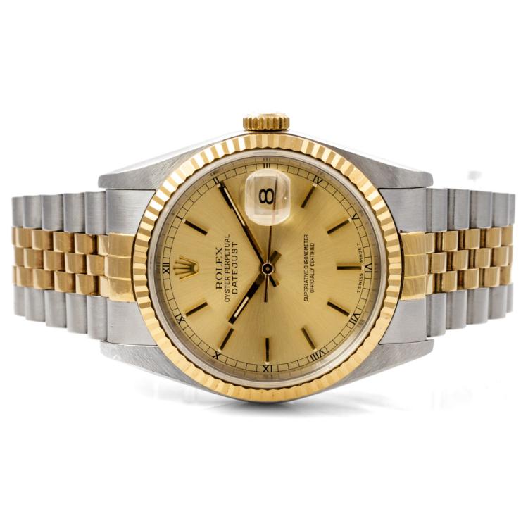 Rolex Oyster Perpetual Datejust 18ct yellow gold and stainless steel. Gold dial, date, case diameter: 36mm, wrist size: 18cm, Swiss made. Ref# 16233. Circa: 1989. With Rolex two tone Jubilee bracelet and clasp. With Certificate of Authenticity and Rolex box with Rolex gift bag. 3 month FSA warranty (Pre-owned)
