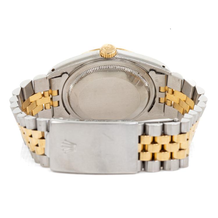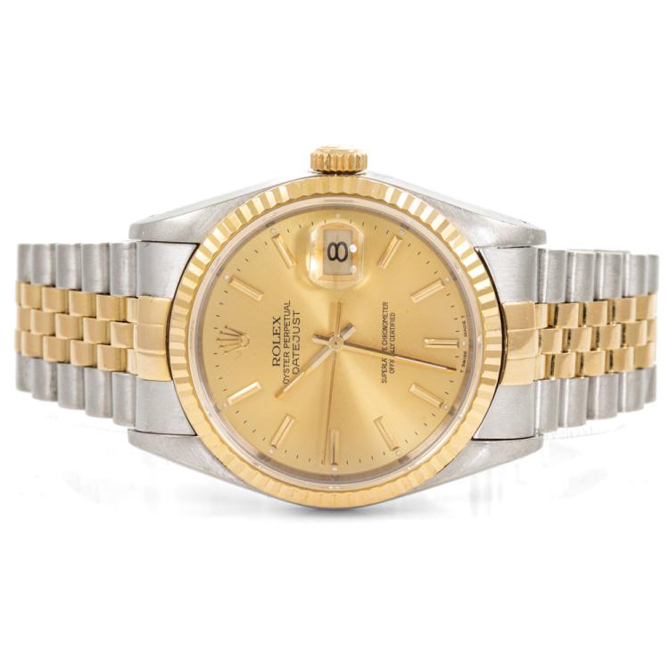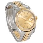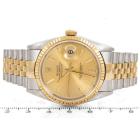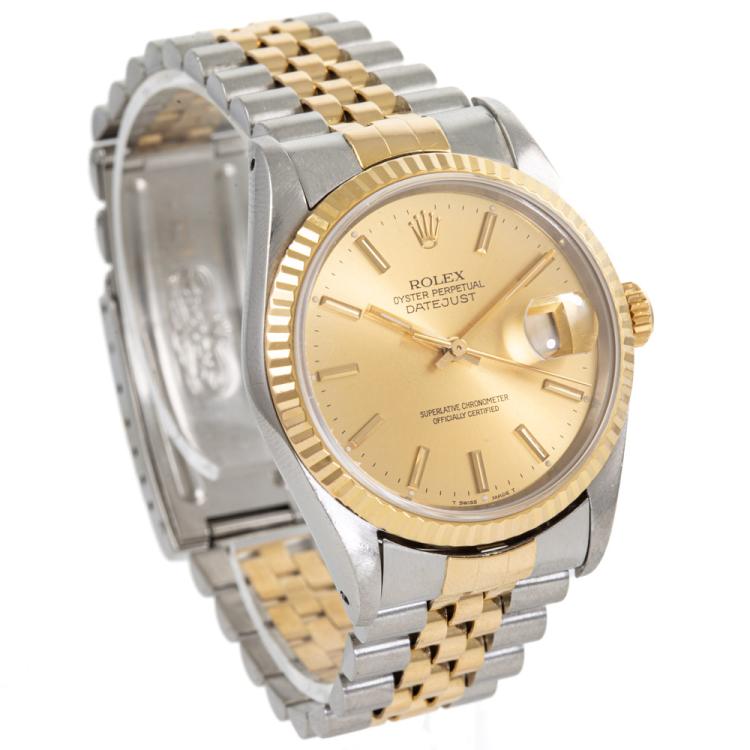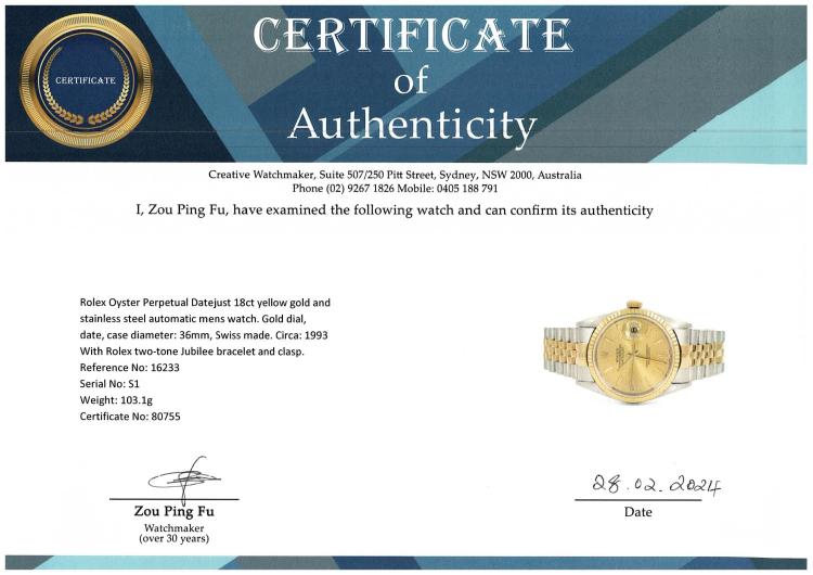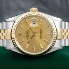 Rolex Oyster Perpetual Datejust 18ct yellow gold and stainless steel automatic mens watch. Gold dial, date, case diameter: 36mm, wrist size: 18.5cm, Swiss made. Ref# 16233. Circa: 1993. With Rolex two-tone Jubilee bracelet and clasp. With Certificate of Authenticity and Rolex box. 3 month FSA warranty (Pre-owned)